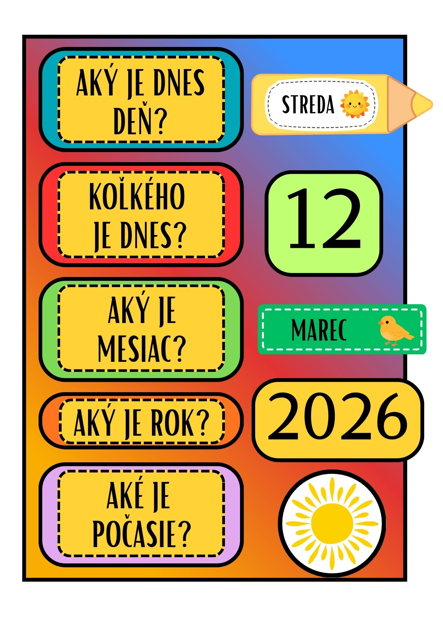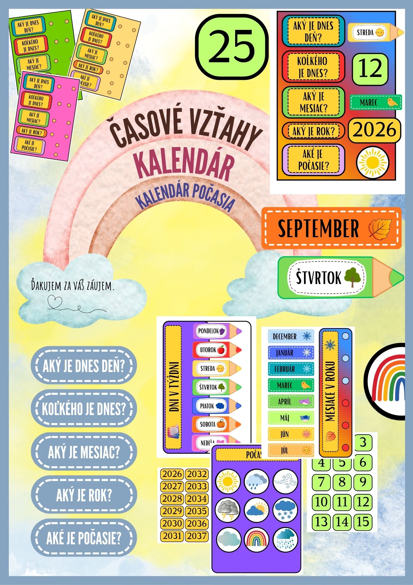 - hlavný kalendár A4 (4 farebné verzie) s otázkami: deň, dátum, mesiac, rok, počasie