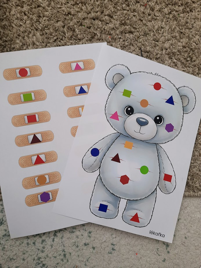 Zábavné spájanie, pri ktorom sa deti nenásilnou formou učia geometrické tvary a farby. Stačí vytlačiť, vystrihnúť náplasti a ošetrovanie môže začať!