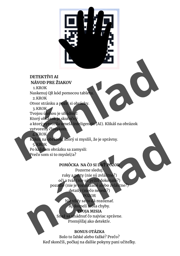 Nechýba ani aktivita „Detektívi AI“, ktorá pracuje s ďalšími QR kódmi a rozvíja schopnosť žiakov rozlišovať medzi reálnym a AI generovaným obsahom.