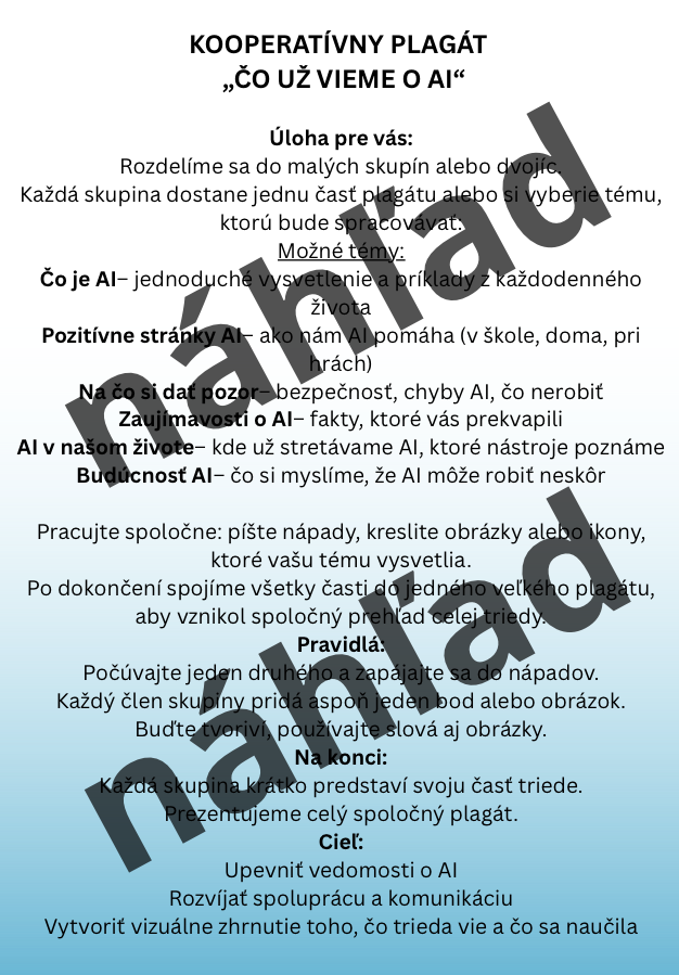 Záverečná strana je venovaná tvorbe kooperatívneho plagátu „Čo už vieme o AI“, kde žiaci spoločne sumarizujú nadobudnuté poznatky, diskutujú a vytvárajú triedny výstup.