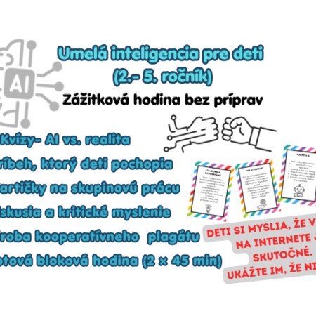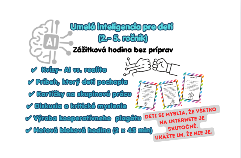 Tento materiál je pripravený ako ucelená bloková hodina na tému umelej inteligencie pre žiakov 1. stupňa ZŠ a vedie ich krok za krokom od prvého stretnutia s AI až po jednoduché pochopenie jej fungovania, možností aj rizík. Je koncipovaný tak, aby bol pre žiakov zrozumiteľný, zážitkový a interaktívny, a zároveň aby učiteľ nemusel nič dodatočne pripravovať.