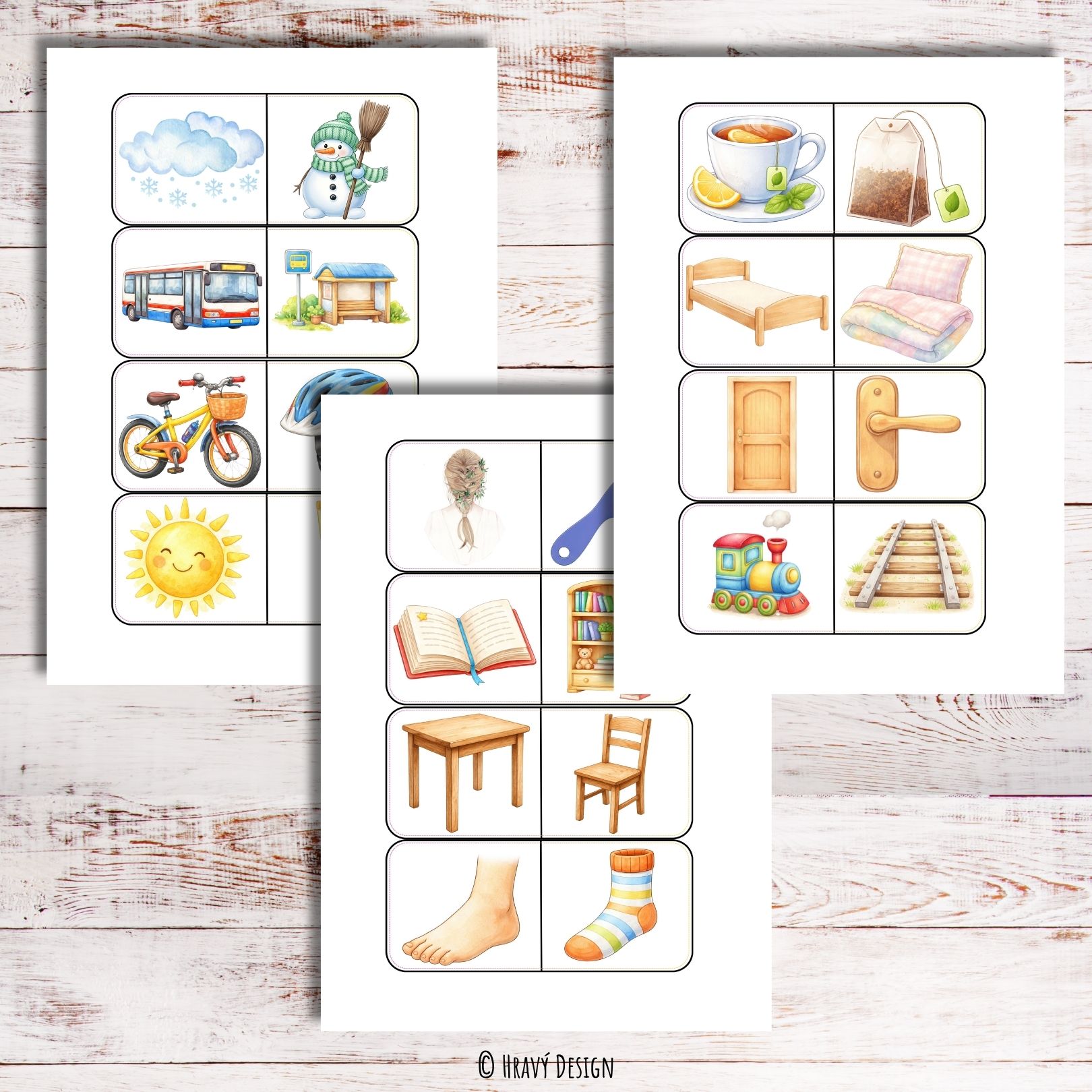 Súbor „Čo k sebe patrí“ obsahuje 44 obrázkových skladačiek, ktoré rozvíjajú logické myslenie, sústredenie a slovnú zásobu.