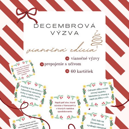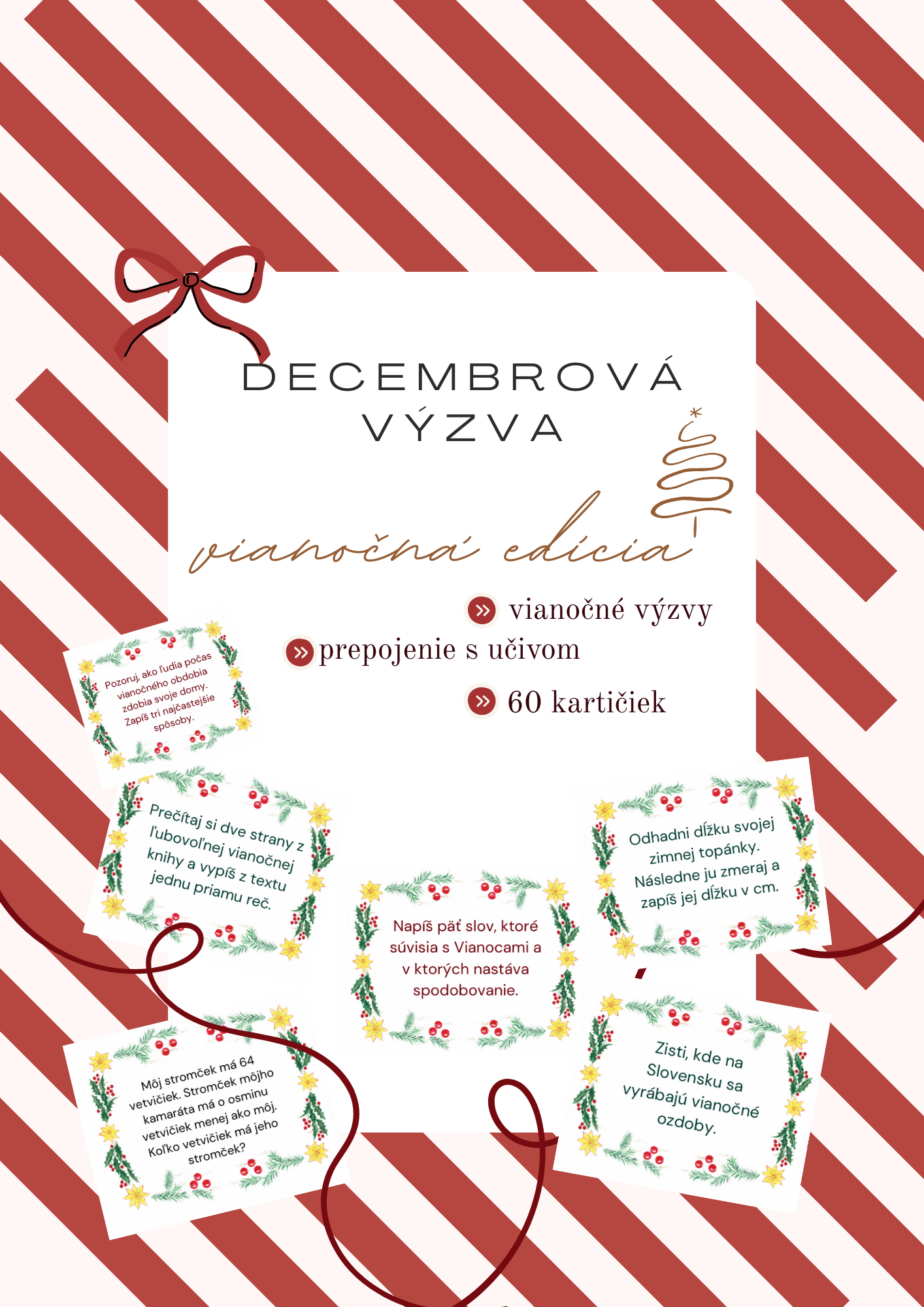 Súbor obsahuje 60 kartičiek s rôznymi výzvami súvisiacimi so zimou a s vianočným obdobím, ktoré sú zároveň vždy istým spôsobom prepojené na precvičenie určitej oblasti z predmetov matematika, slovenský jazyk, prírodoveda a vlastiveda, pričom ide napr. o tieto oblasti: