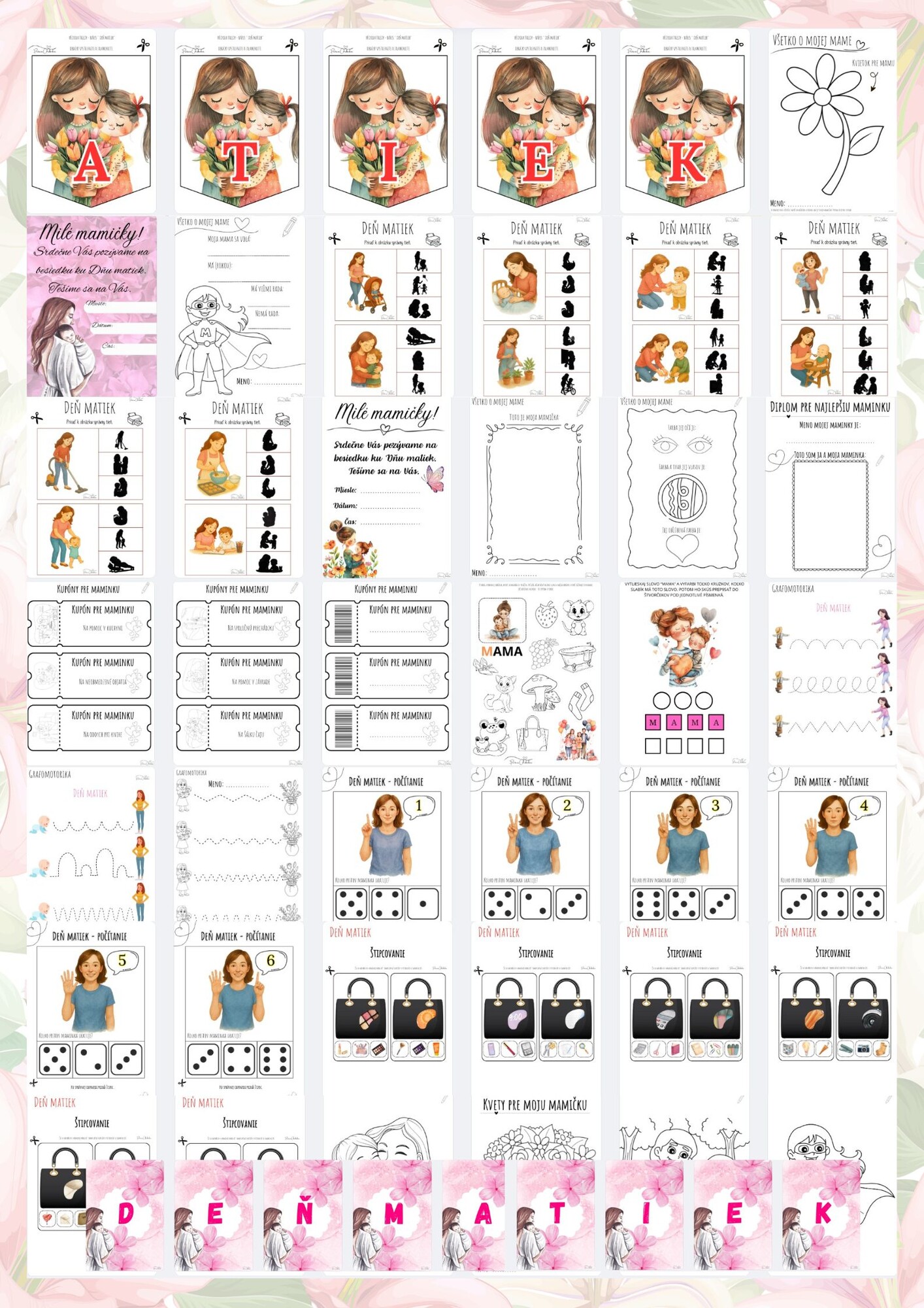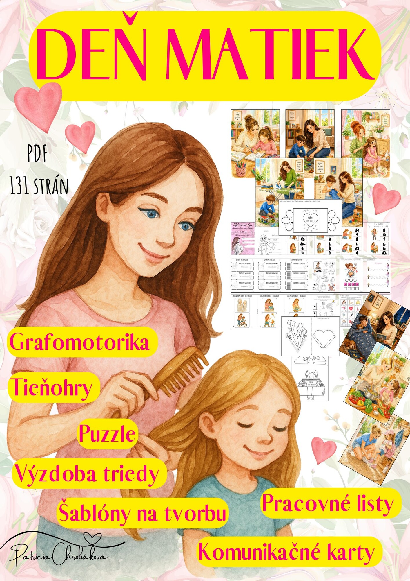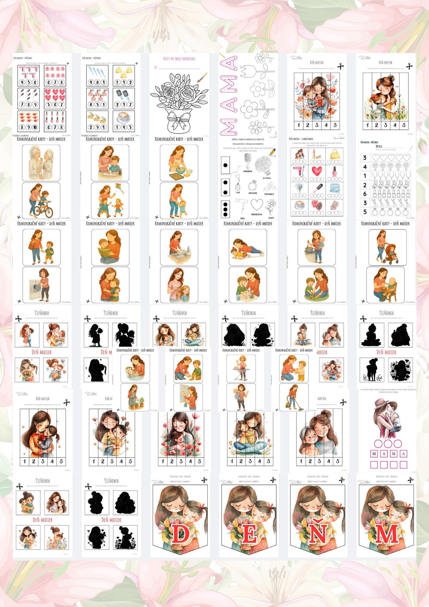 Obsah: Súbor obsahuje 131 strán, pracovné listy ktoré možno využiť pri tvorbe knihy pre mamu, diplomy pre najlepšiu mamu, grafomotoriku, listy zamerané na hláskovanie, komunikáciu, počítanie, pozvánky na besiedku ku Dňu matiek, kupóny na vystrihnutie pre mamu, priraďovacie aktivity podľa opisu, demonštračné obrázky k téme, puzzle, štipcovanie, šablóny na vyfarbenie - tvorbu, tieňohry, komunikačné kartičky k danej téme, nápis (DEŇ MATIEK) 2x - výzdobu triedy, pracovné listy,...