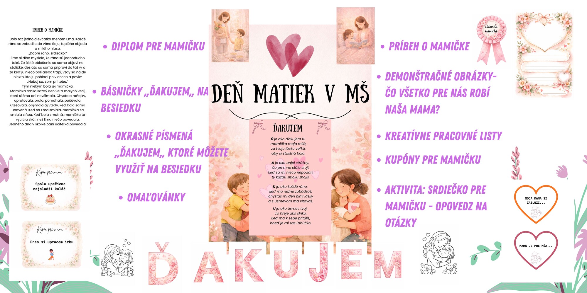 Materiál je pripravený tak, aby ste ho vedeli využiť v rannom kruhu, pri tematických aktivitách, na nástenku aj ako milý výstup pre mamičky. Pomáha deťom rozvíjať vďačnosť, slovnú zásobu, vyjadrovanie citov aj jemnú motoriku – a vám šetrí čas pri príprave aktivít.
