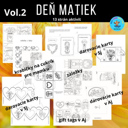 Súbor otváracích kariet ku dňu matiek, plus krabička na malý cukrík, záložky. Obrázky si vymaľuj a dopíš odkaz pre mamku.