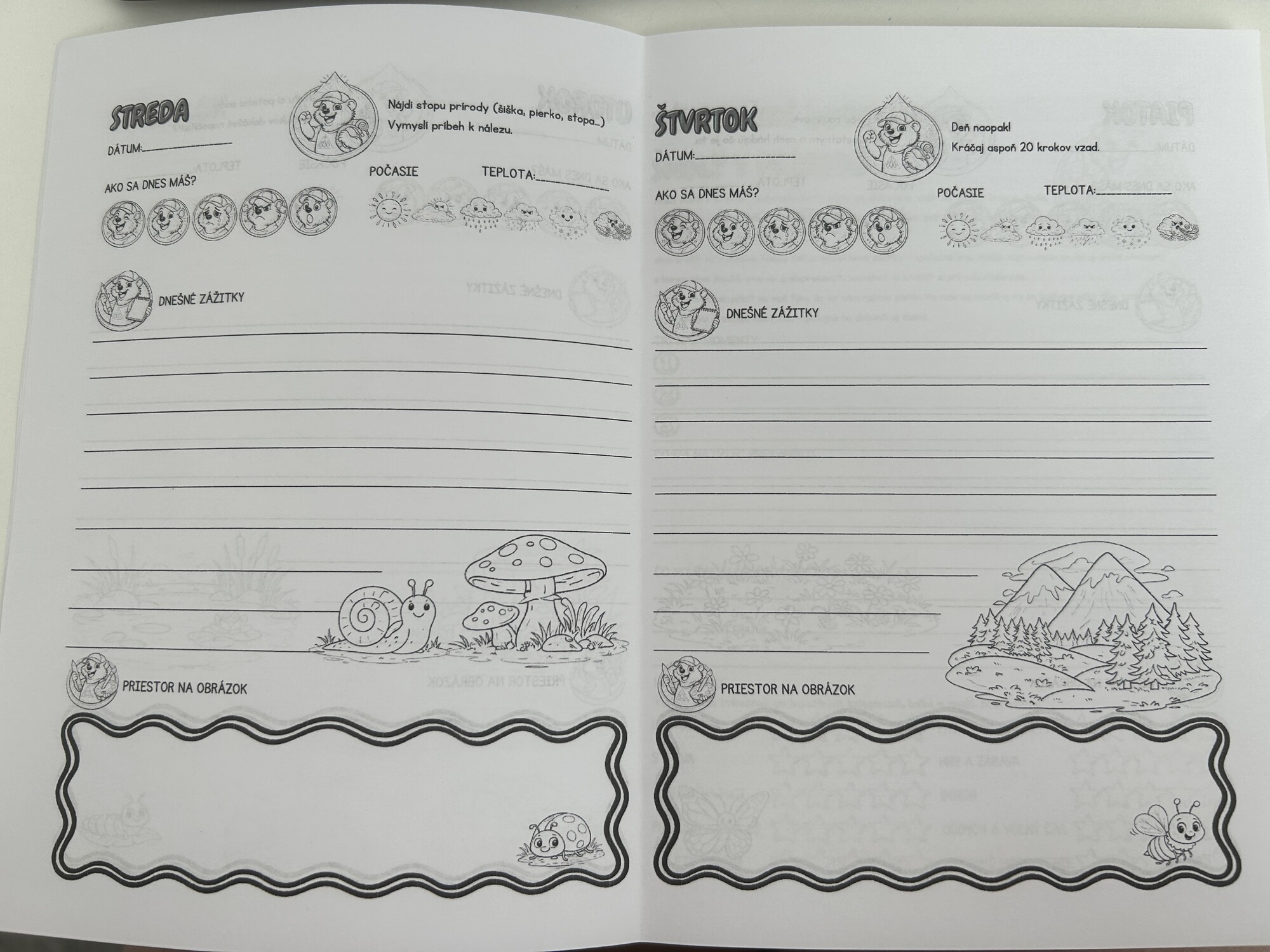 Nie je potrebné vyplniť všetky strany naraz. Niektoré úlohy môžu deti dokončiť aj neskôr, napríklad počas oddychu alebo po návrate domov. Denník tak slúži nielen počas pobytu, ale aj ako pekná spomienka, ku ktorej sa môžu vrátiť.