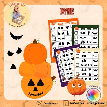 Štyri deti si rozdajú karty medzi sebou. Určia si, kto bude hádzať kockou jako prví. Podľa toho, čo padne na kocke za číslo, deti priraďujú oči, nos a pusu podľa karty- Podľa toho im vznikne dyňa.