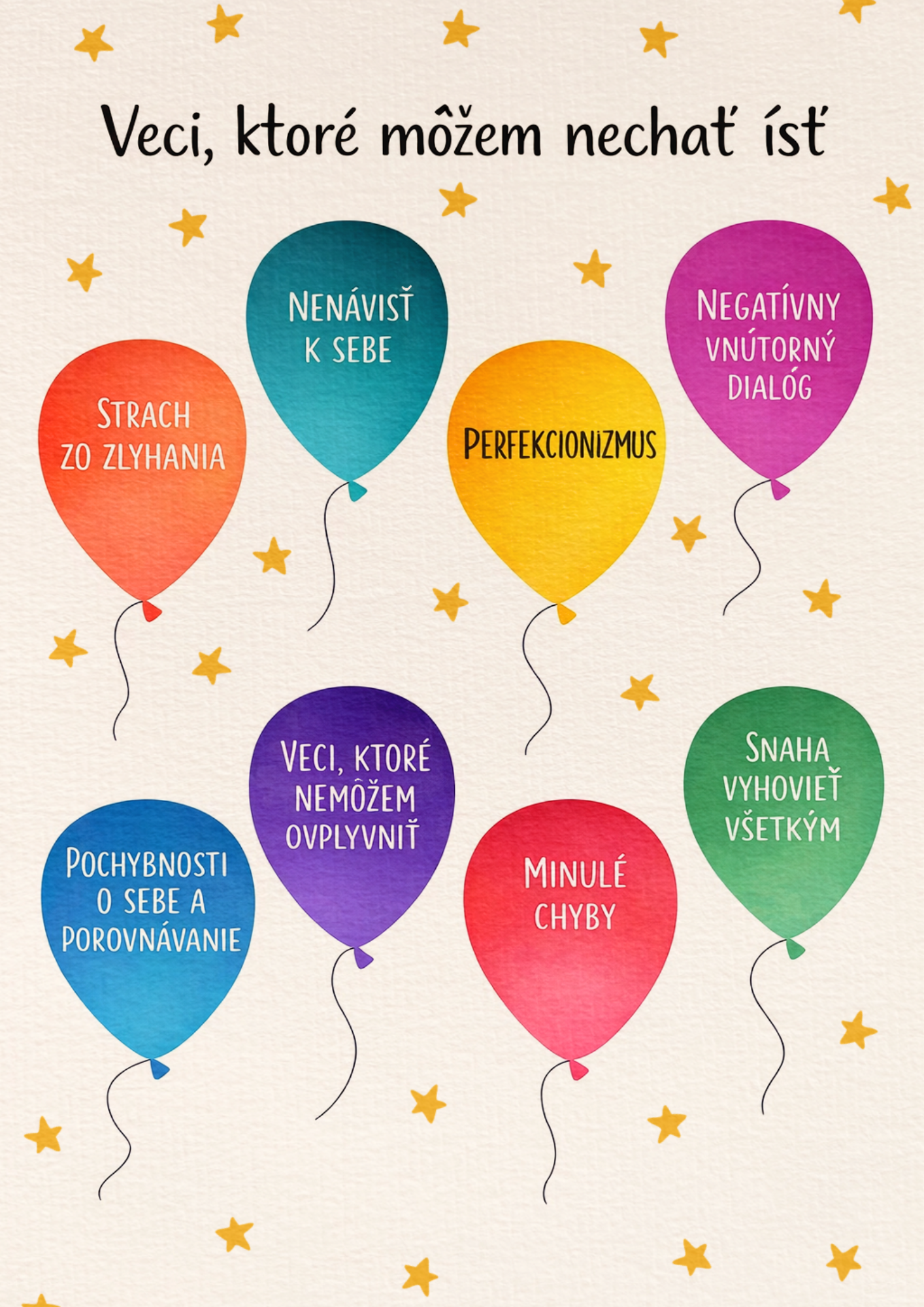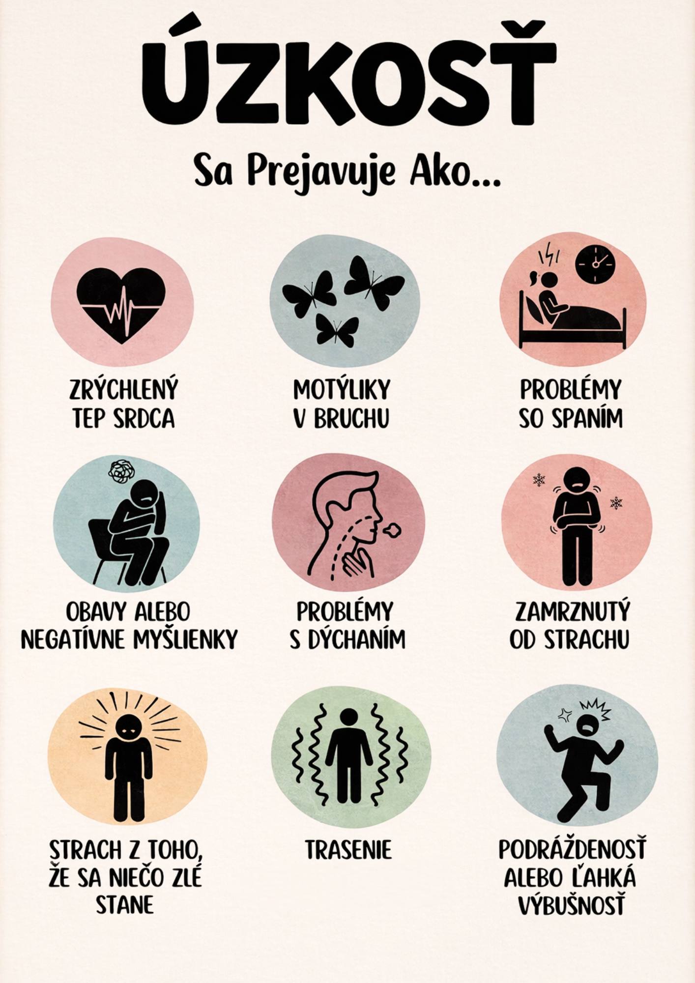 Sada dvoch edukatívno-motivačných plagátov podporujúcich duševné zdravie. Prvý vizuálne vysvetľuje, ako sa môže úzkosť prejavovať v tele aj v mysli. Druhý jemnou formou ukazuje veci, ktoré môžeme „pustiť z hlavy“ – ako perfekcionizmus, strach zo zlyhania či negativitu. Vhodné pre školy, psychológov aj učiteľov.