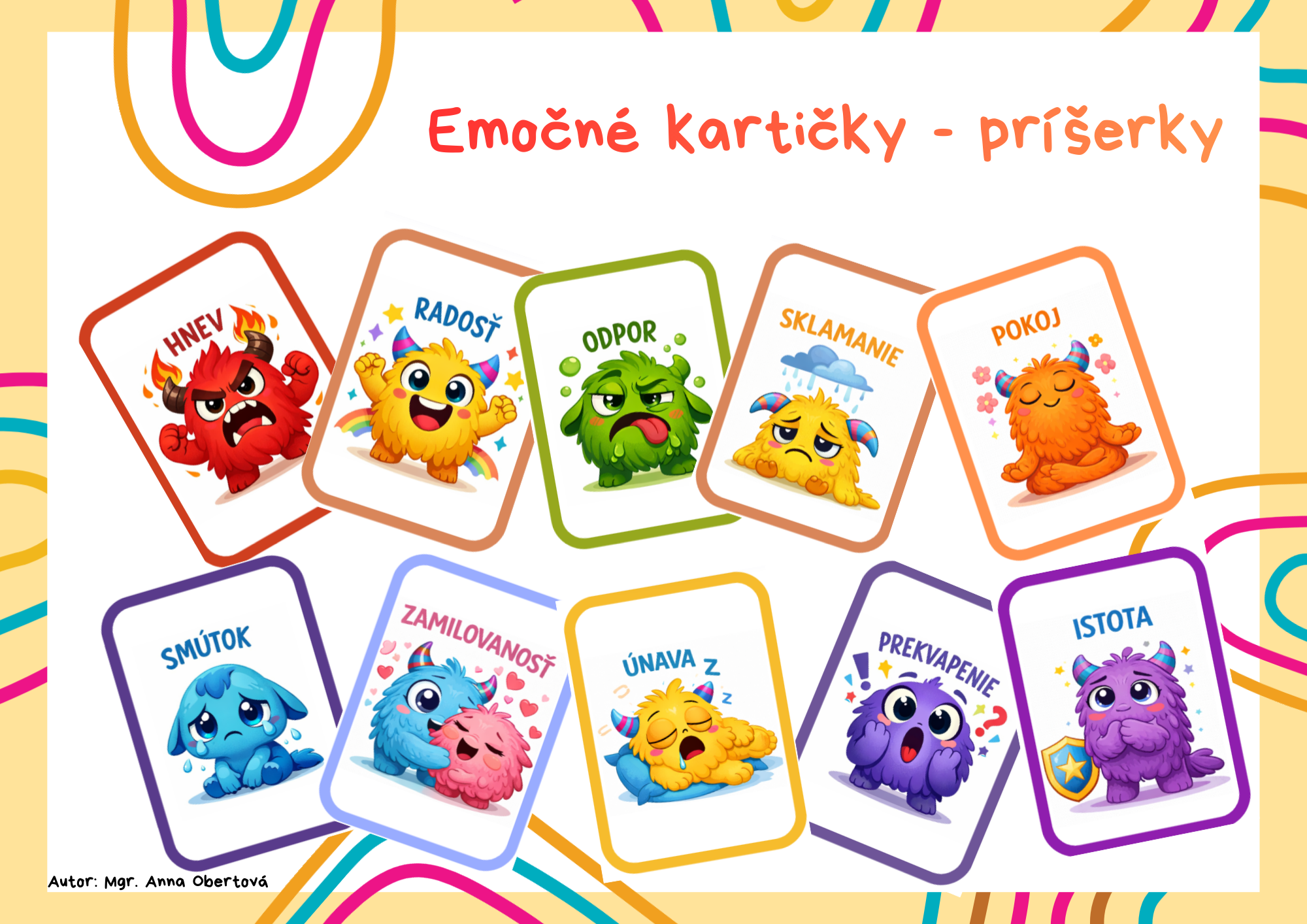 - 30 kartičiek s príšerkami (každá príšerka znázorňuje inú emóciu alebo pocit - žiaci tak môžu aj vizuálne identifikovať, čo práve cítia)
