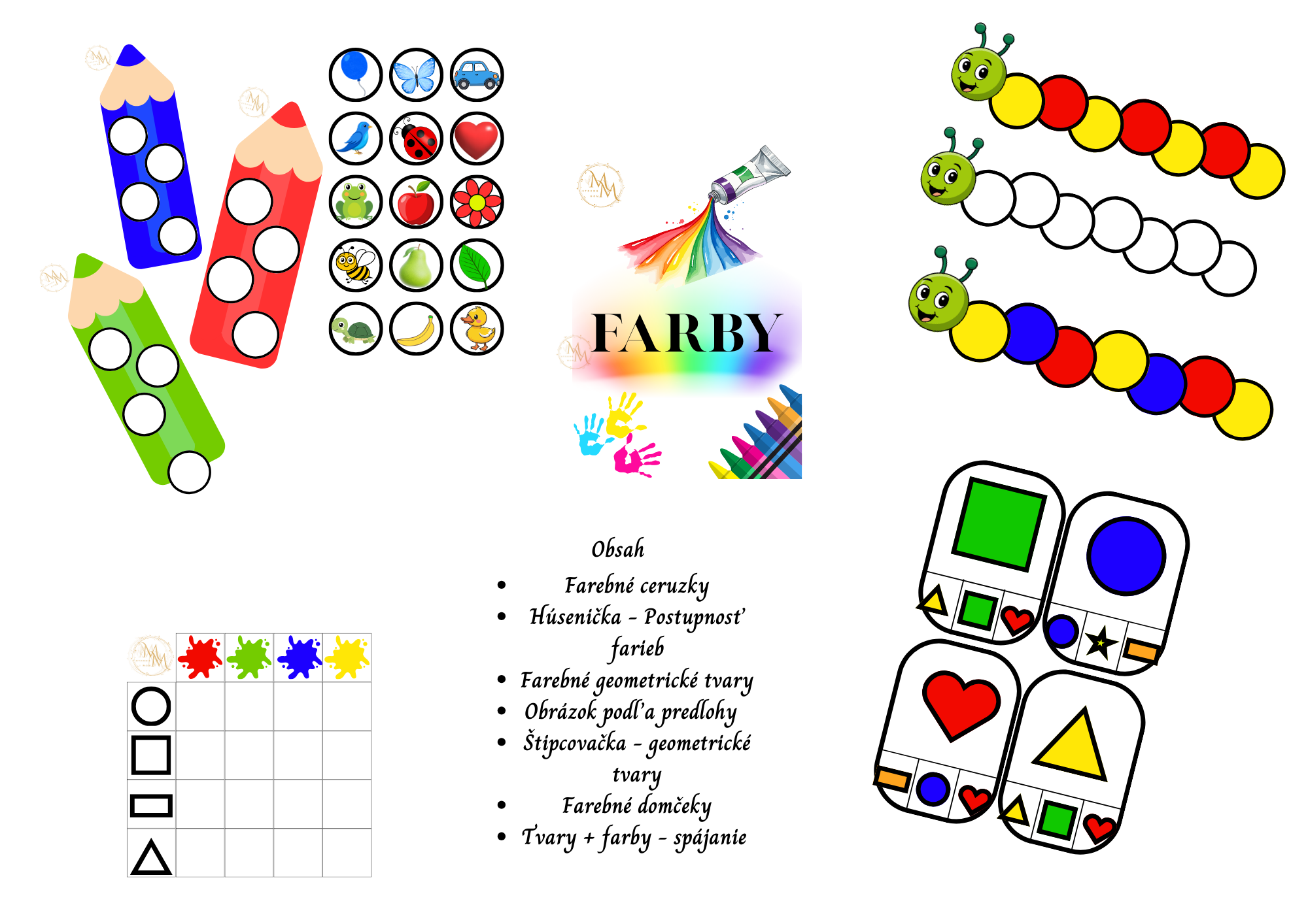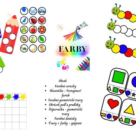 Súbor obsahuje mix rôznych aktivít, zameraných na spoznávanie, triedenie farieb a geometrických tvarov, postupnosť farieb.