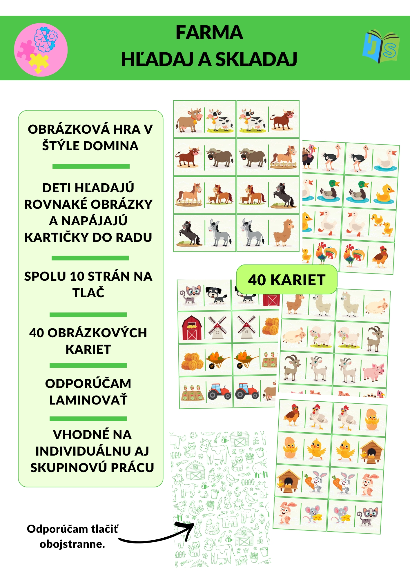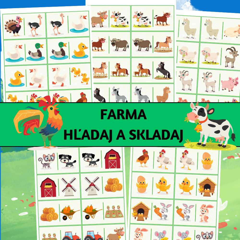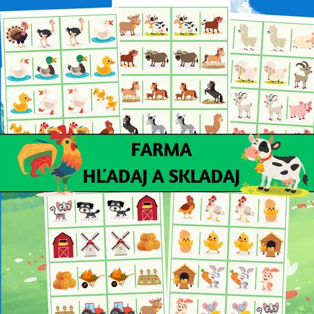 Farma: hľadaj a skladaj je obrázková aktivita inšpirovaná dominom, zameraná na rozvoj zrakovej percepcie, pozornosti, porovnávania a jemnej motoriky. Deti pracujú s obrázkovými kartami, hľadajú rovnaké motívy a správne ich nadväzujú, čím vytvárajú súvislý rad (tzv. domino hada). Materiál je vhodný na individuálnu prácu, prácu vo dvojiciach, skupinách alebo na stanovištiach.