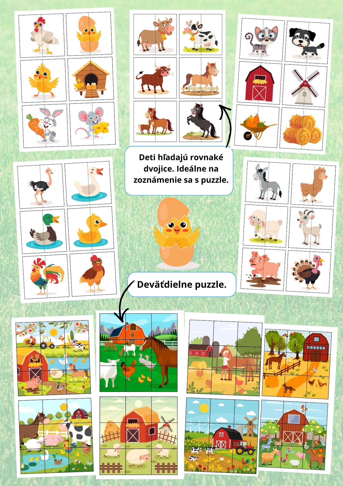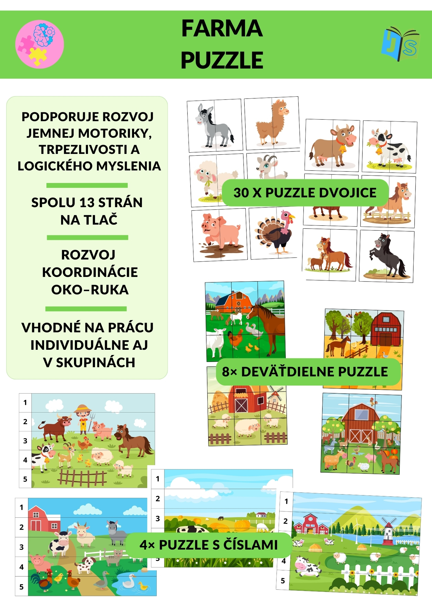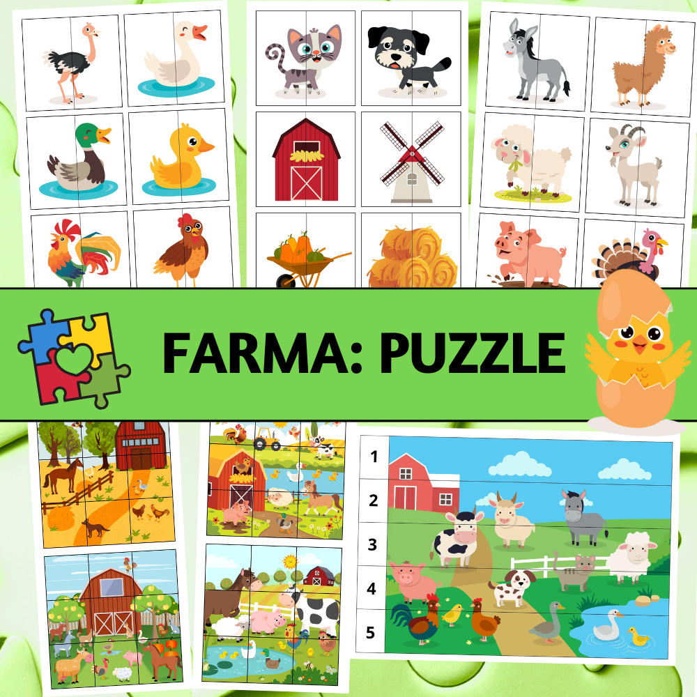 Farma puzzle je aktivita zameraná na rozvoj vizuálnej percepcie, pozornosti, logického myslenia a jemnej motoriky u detí predškolského a mladšieho školského veku. Materiál ponúka tri typy puzzle úloh rôznej náročnosti – párovanie obrázkov, skladanie deväťdielneho puzzle a skladanie obrázkov podľa čísel 1–5.