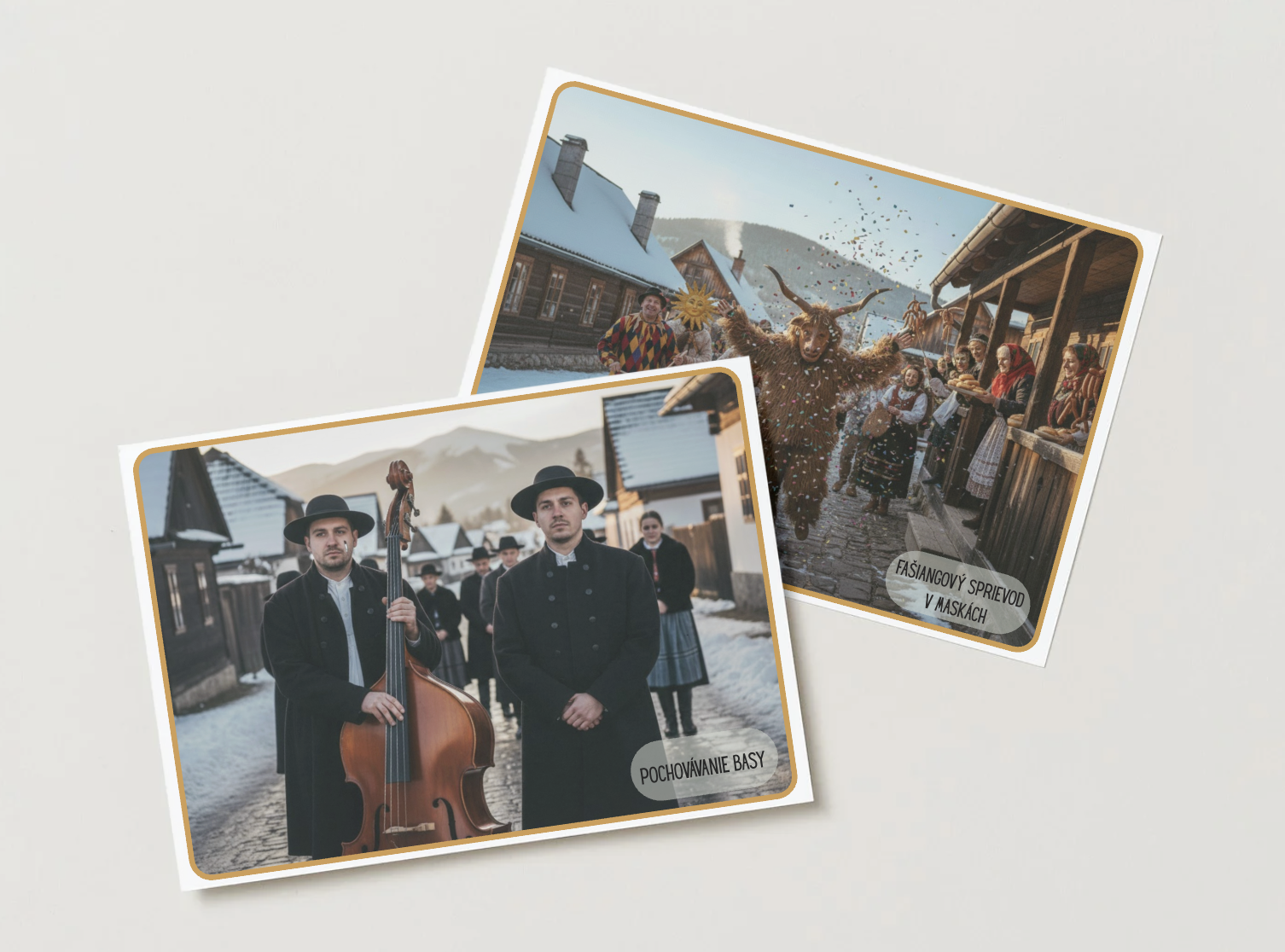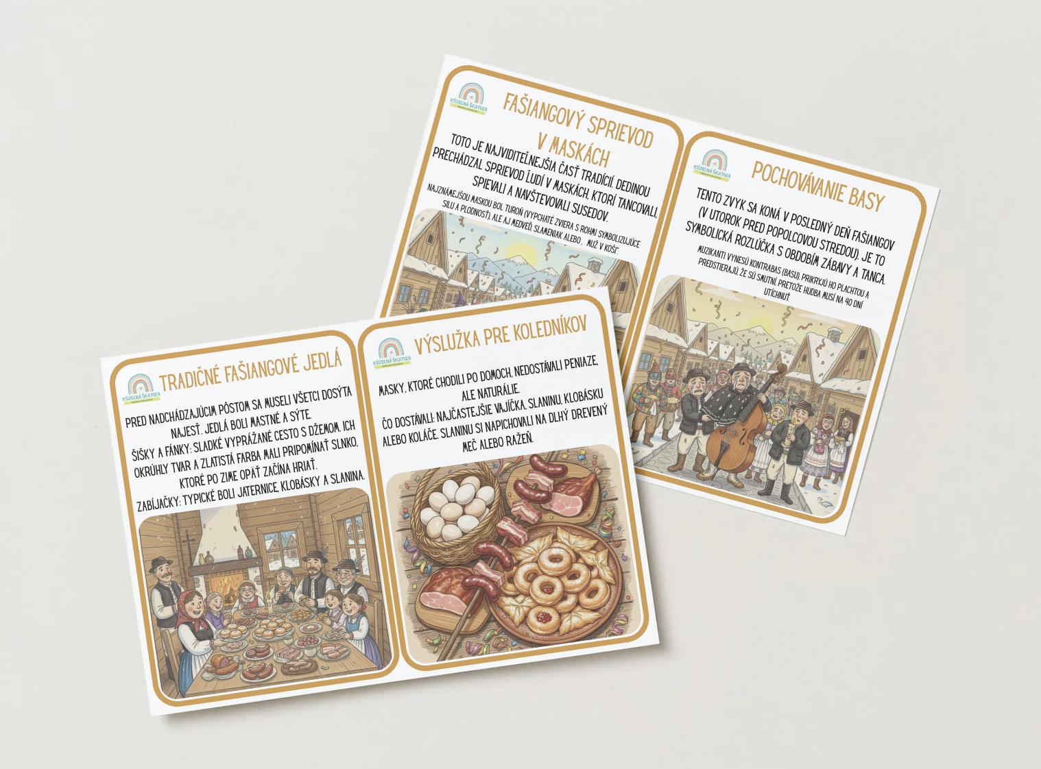 - Demonštračné obrázky: Vybrala som jasné a farebné vizuály (fašiangový sprievod, pochovávanie basy, šišky), ktoré slúžia ako základ pre diskusiu v rannom kruhu.