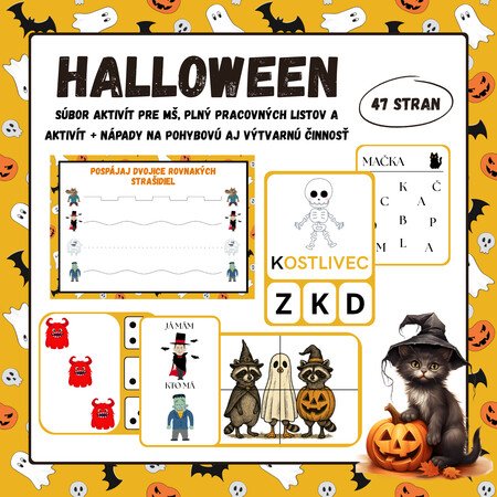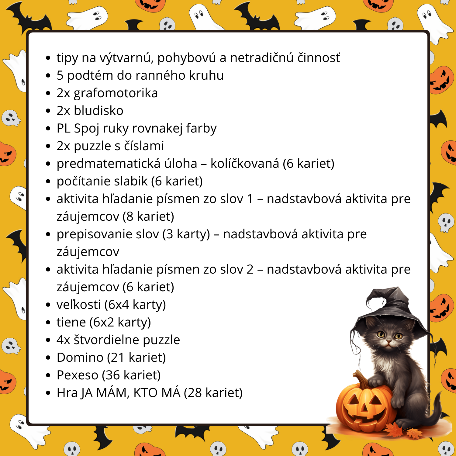 Hľadáte premyslený, hravý a pestrý materiál, ktorý deti nielen zabaví, ale aj niečo naučí? Prinášam vám súbor aktivít na tému Halloween, ktorý vám ušetrí čas a uľahčí prácu.