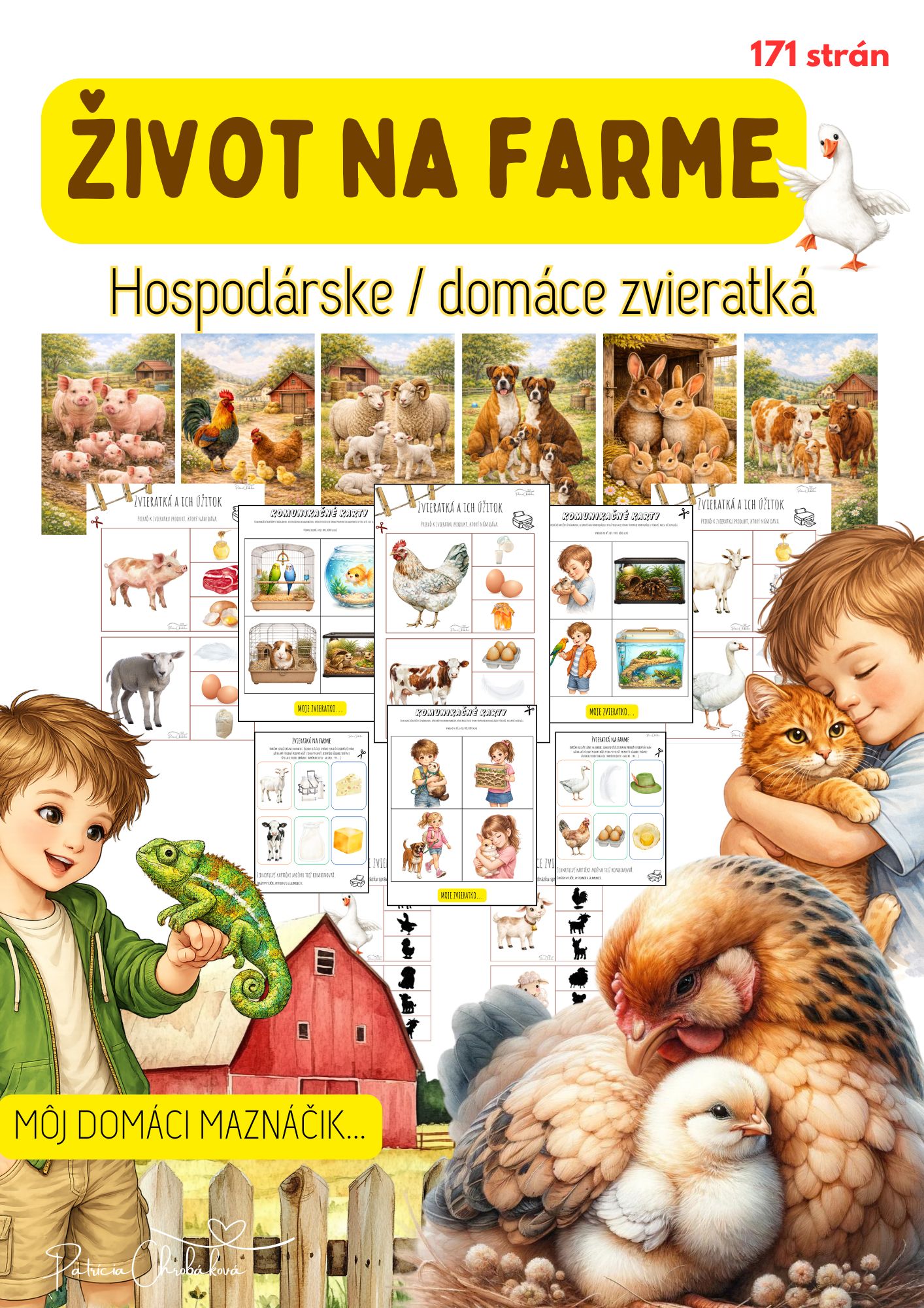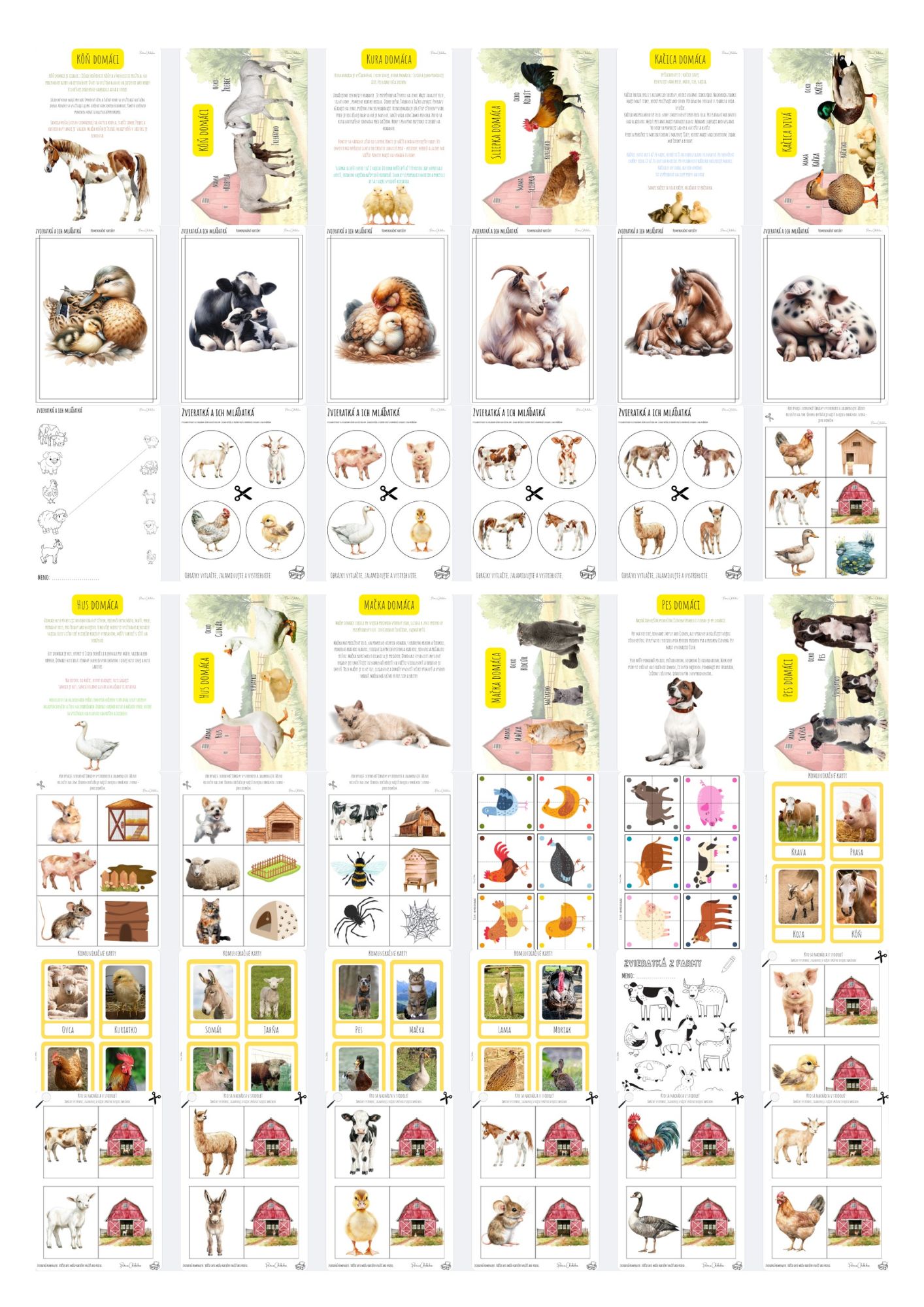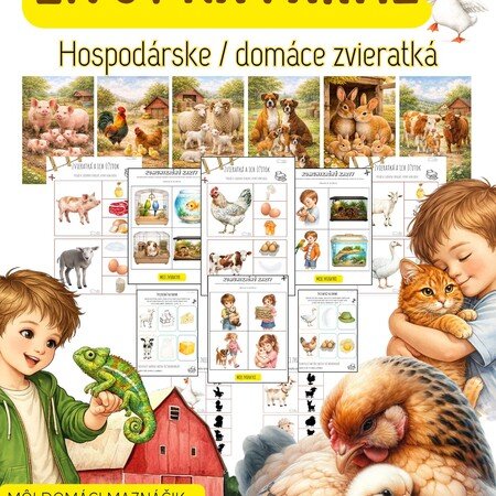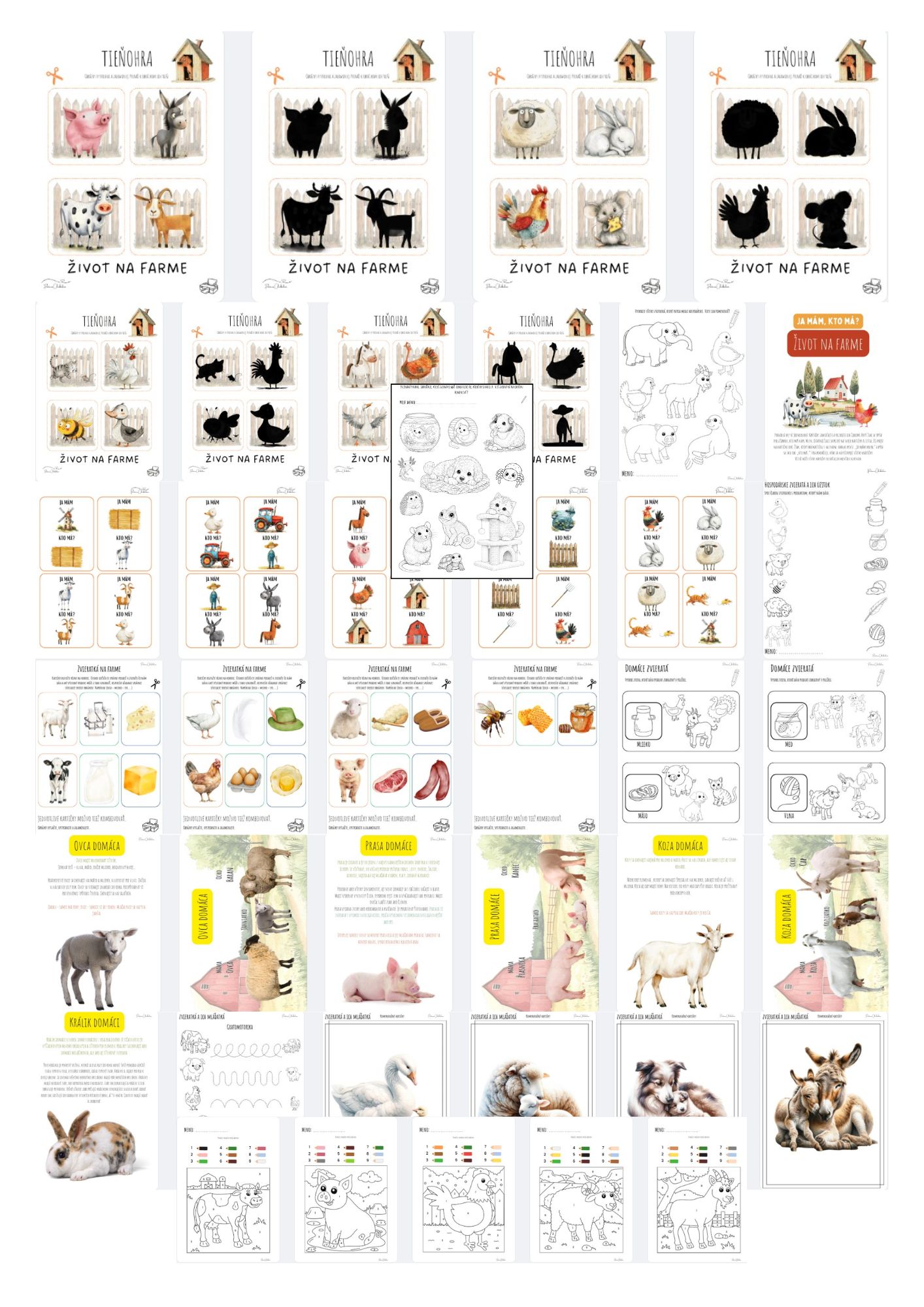 Obsah: Súbor obsahuje 171 strán, pracovné listy zamerané na grafomotoriku, komunikáciu, priraďovacie aktivity - hospodársky úžitok zvierat / hospodárske zvieratá, aktivity s lupou, ..., tieňohry, puzzle, hru: "ja mám, kto má?", štipcovanie, demonštračné obrázky, komunikačné kartičky, materiály vhodné ako výzdoba triedy, samostatné plagáty - zvieratká a ich mláďatá teoretické oboznámenie sa s danou témou (život na farme /hospodárske zvieratká a ich úžitok / zvieratká a ich mláďatá / domáce zvieratá, môj domáci maznáčik - moje zvieratko,..)