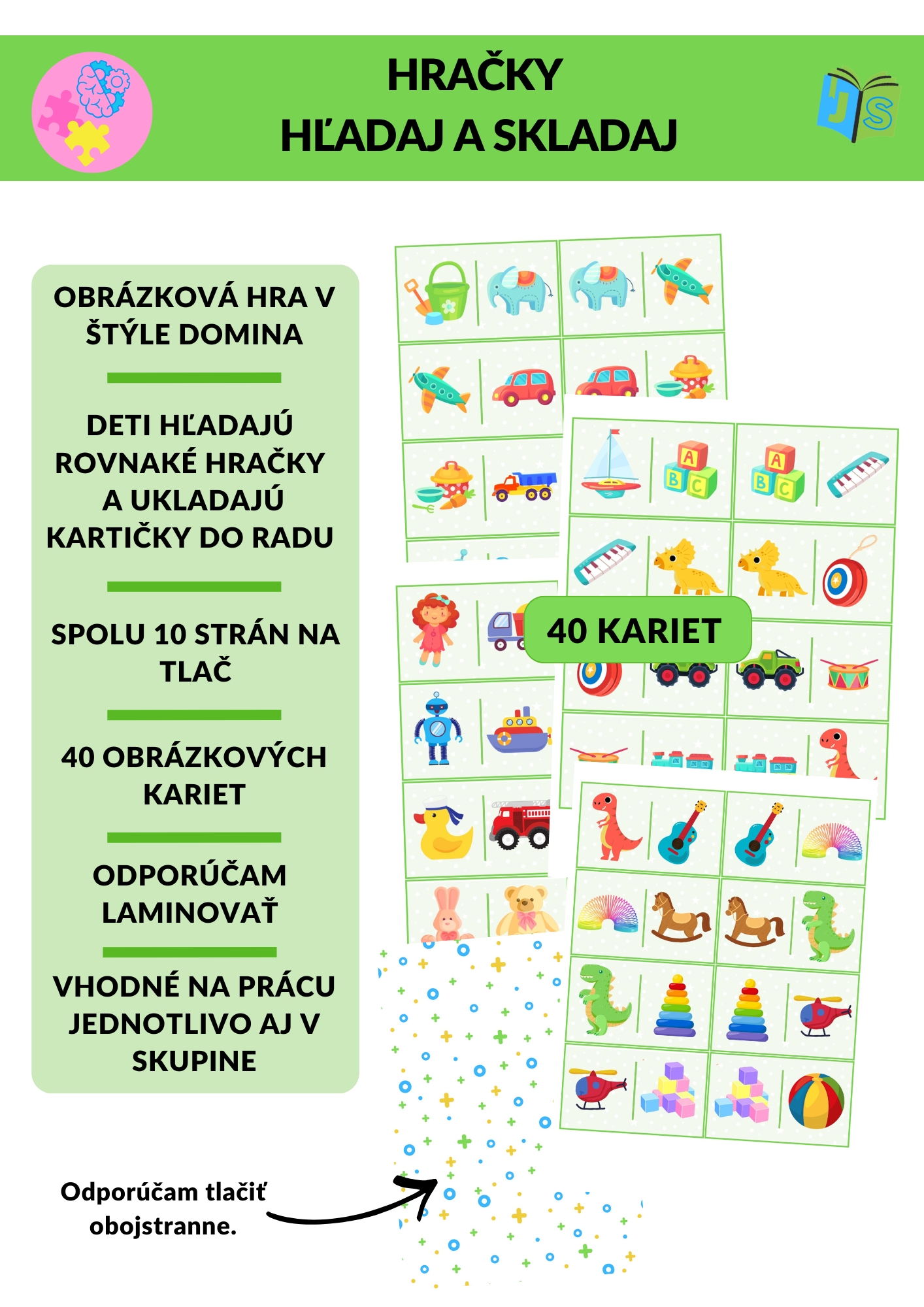 Táto obrázková aktivita v štýle domina je zameraná na rozvoj zrakovej percepcie, pozornosti, vizuálnej pamäti a schopnosti porovnávania. Deti hľadajú zhodné obrázky hračiek a ukladajú kartičky do radu, čím vzniká tzv. „domino had“. Materiál je vhodný na prácu v triede, na stanovištiach, v centrách aktivít aj pri individuálnej činnosti. Aktivitu možno využiť aj v rámci špeciálnej pedagogiky, pri rozvoji školskej zrelosti alebo v domácom vzdelávaní. Odporúčame laminovať pre opakované využitie.