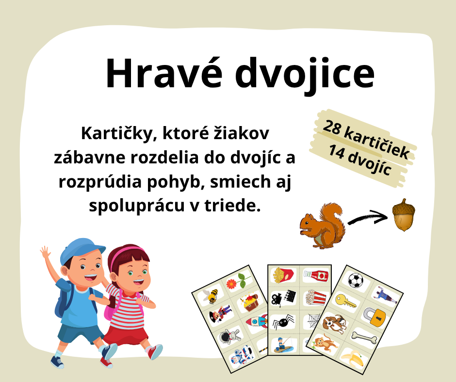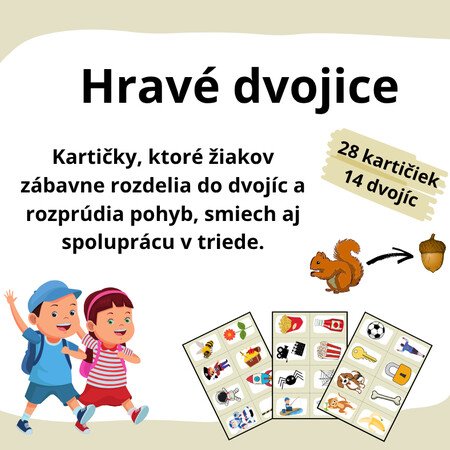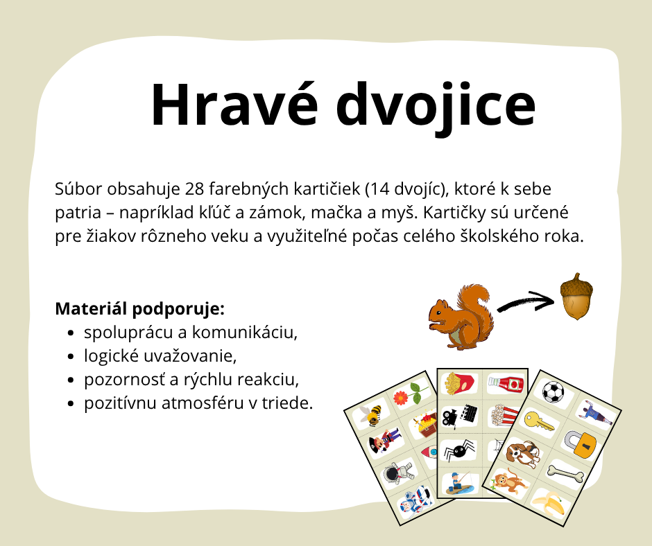 Súbor obsahuje 28 farebných kartičiek (14 dvojíc), ktoré k sebe patria – napríklad kľúč a zámok, mačka a myš. Kartičky sú určené pre žiakov rôzneho veku a využiteľné počas celého školského roka.