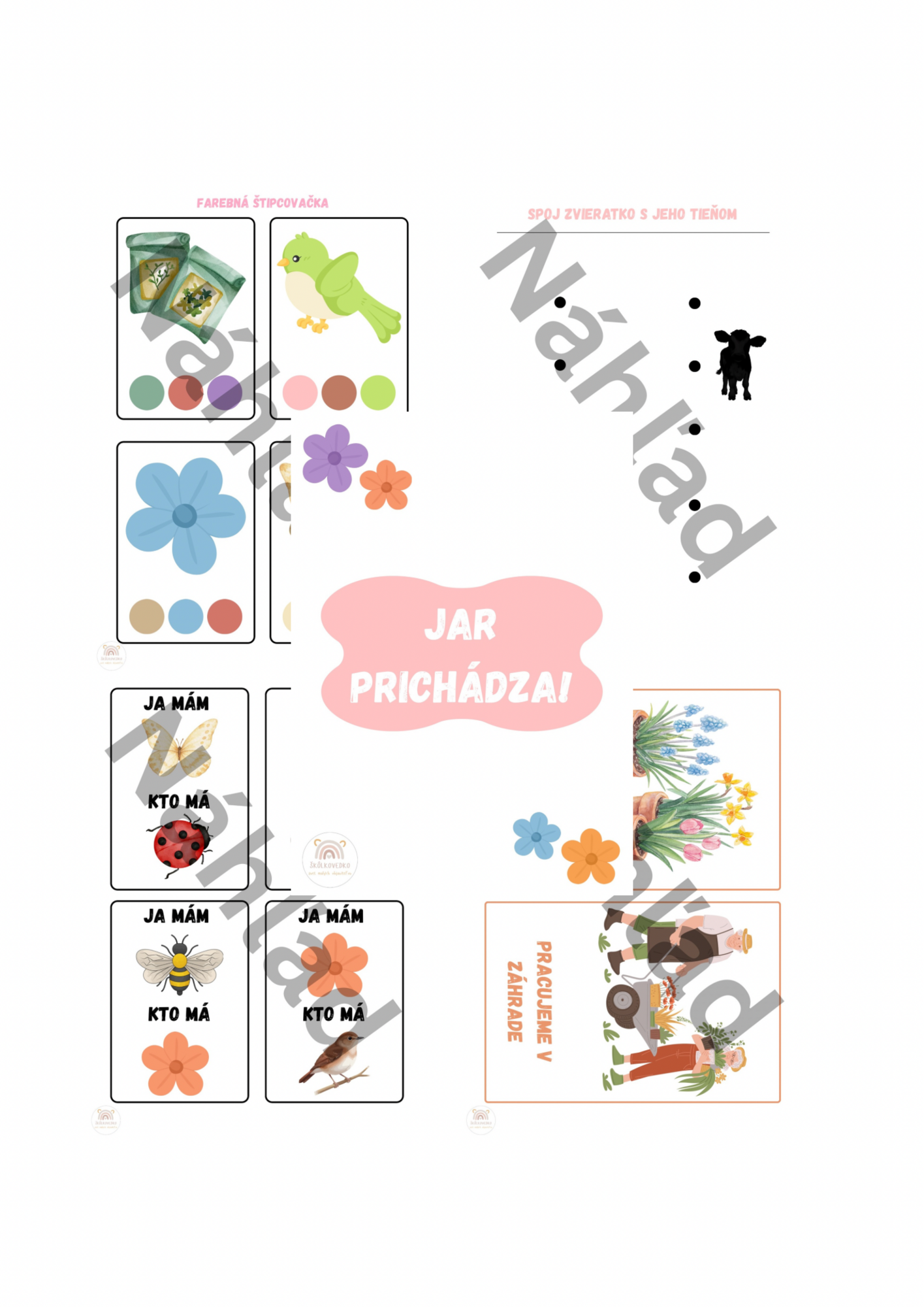 3 pracovné listy (grafomotorika, spájanie tieňov, čo patrí k jari)