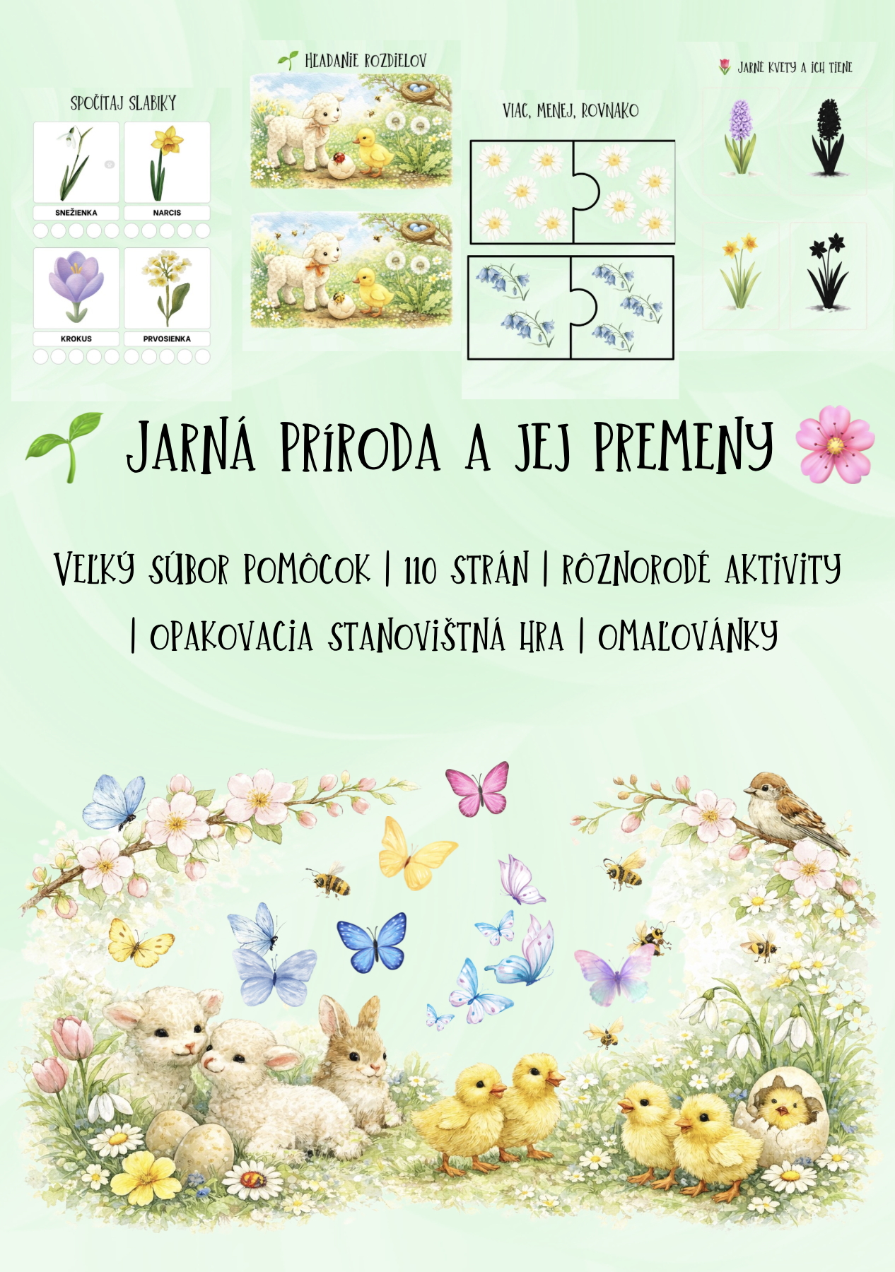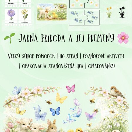 Rozsiahly vzdelávací súbor aktivít zameraný na jarnú prírodu, jej premeny, mláďatá a kvitnúce rastliny. Materiál je vhodný pre deti v materskej škole a ponúka pestrú kombináciu poznávacích, triediacich, jazykových aj logických aktivít.