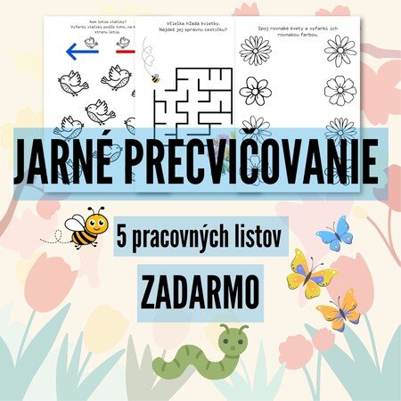 Pripravila som 5 pracovných listov, ktoré sú skvelým doplnkom k jarnej téme v škôlke. Deti si na nich hravou formou precvičia rôzne zručnosti. Materiál je vhodný pre deti vo veku 3 – 6 rokov – do škôlky aj na domáce precvičovanie.