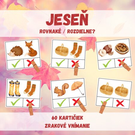 Jednotlivé kartičky vystrihnite a pre dlhšiu výdrž zalaminujte. Deti majú za úlohu pripnúť štipec na políčko s fajkou (ak sú obrázky na kartičke rovnaké) alebo na políčko s krížikom (ak sú obrázky na kartičke rozdielne). Deti môžu tiež kartičky triediť na tie, ktoré obsahujú rovnaké / rozdielne obrázky, môžu ich počítať atď.