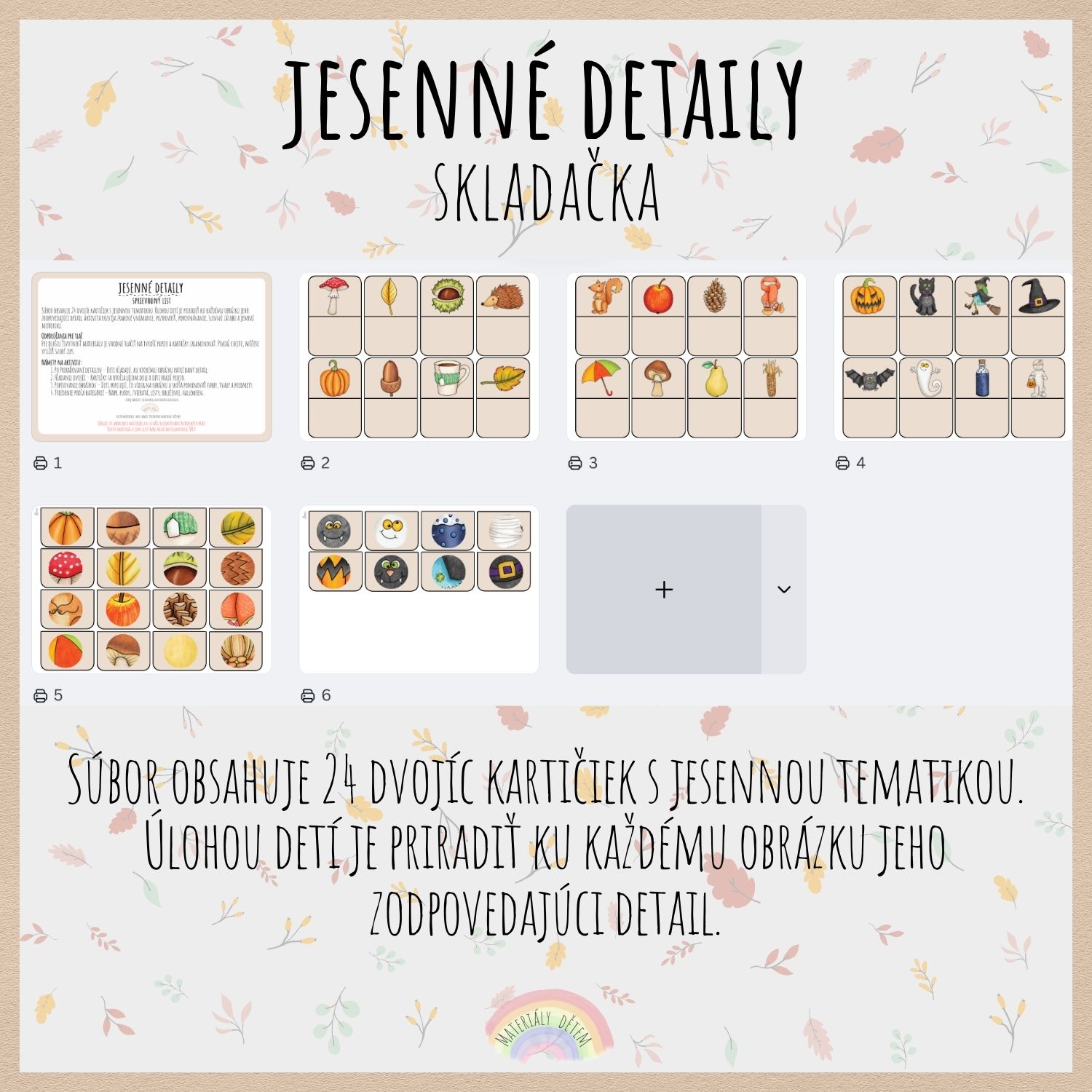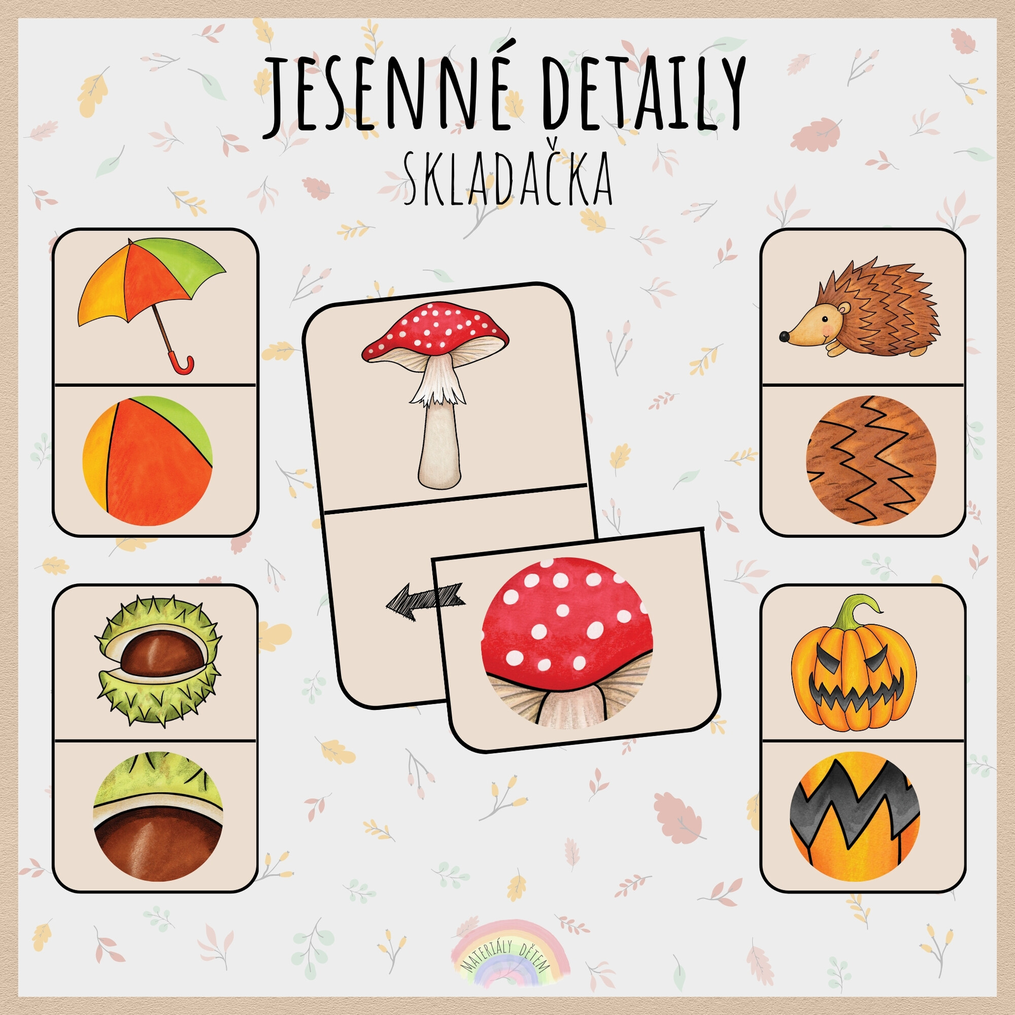 Súbor obsahuje 24 dvojíc kartičiek s jesennou tematikou. Úlohou detí je priradiť ku každému obrázku jeho zodpovedajúci detail. Aktivita rozvíja zrakové vnímanie, pozornosť, porovnávanie, slovnú zásobu a jemnú motoriku.
