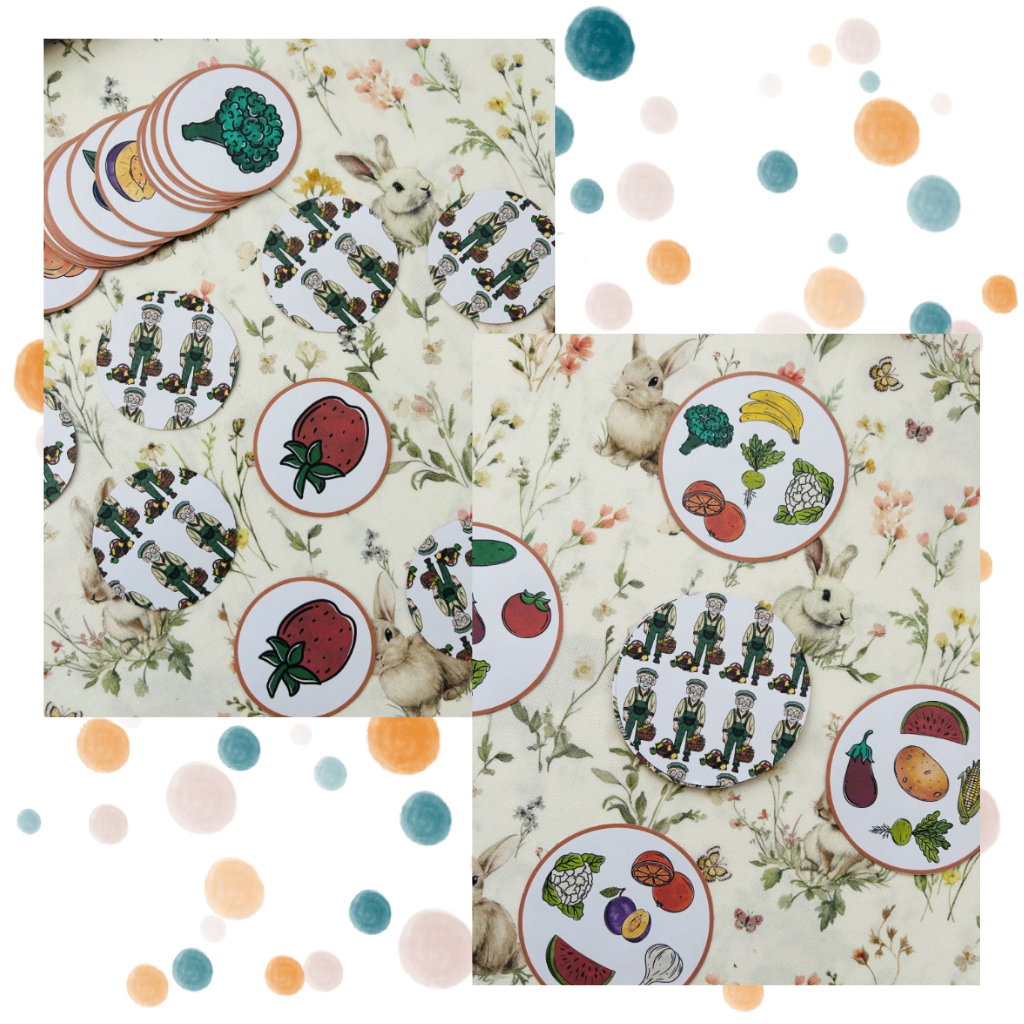 Klasická pamäťová hra obsahujúca 18 dvojíc kartičiek s obrázkami ovocia a zeleniny. Deti si precvičujú zrakovú pamäť, sústredenie aj rozpoznávanie jednotlivých potravín. Aktivitu je možné obohatiť o pomenúvanie obrázkov, určovanie farieb alebo zdieľanie skúseností – napríklad či dané ovocie alebo zeleninu deti poznajú alebo majú rady.