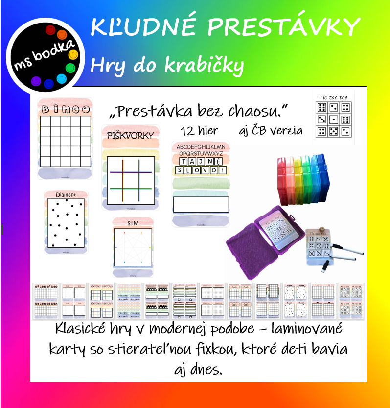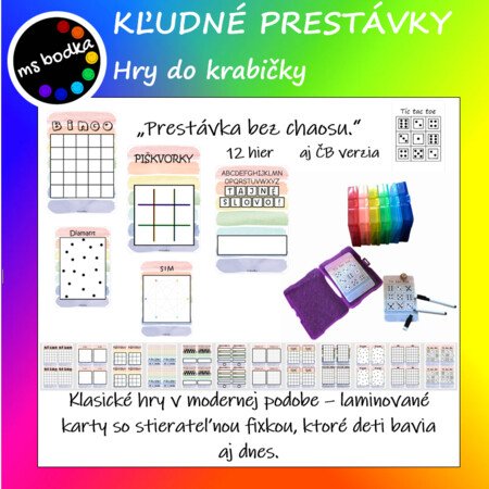 Kľudné prestávky sú praktický balík 12 klasických hier v modernom spracovaní, určený na pokojné prestávky v triede, chvíle po rýchlejšom dokončení práce alebo využitie v ŠKD, vo formáte vhodnom do farebných plastových boxov.