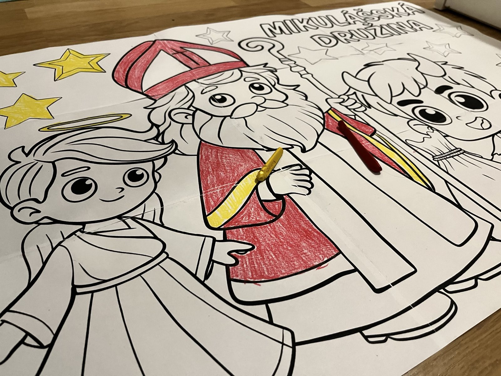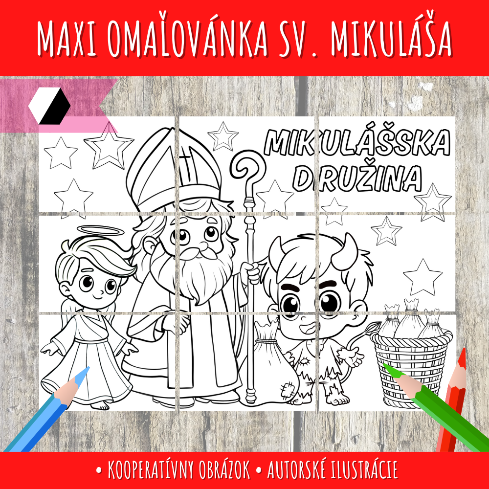 Kooperatívna maxiomaľovanka na svätého Mikuláša môže vo vašej triede poslúžiť ako výborný nástroj na stmelenie kolektívu, ale aj ako milá zimná výzdoba. Zimný obrázok s mikulášskou družinou je rozdelený na 9 strán A4. Deti si ho môžu vyfarbovať samostatne, vo dvojiciach alebo v skupinkách a po dokončení si z jednotlivých častí zložia veľký a originálny obraz so sv. Mikulášom.