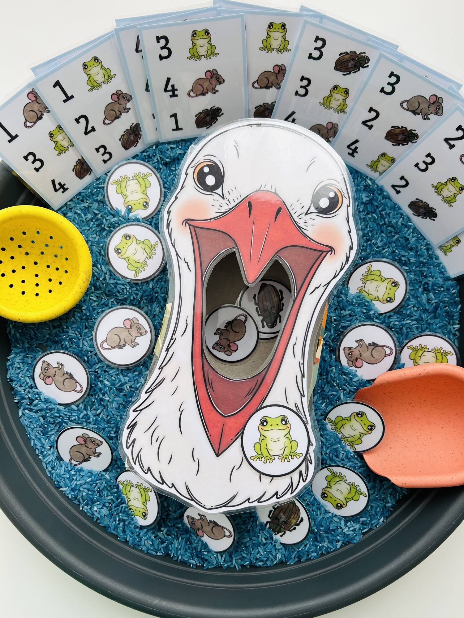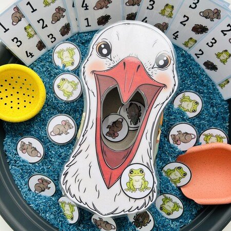 Tento materiál je ako stvorený pre sensory play, ktoré deti prirodzene milujú. Kartičky s potravou sa vkladajú do sypkého materiálu (napr. ryža, cícer, cestoviny), kde ich deti hľadajú, objavujú a následne kŕmia bociana – čím dochádza k intenzívnemu zapojeniu zmyslov aj sústredenia.