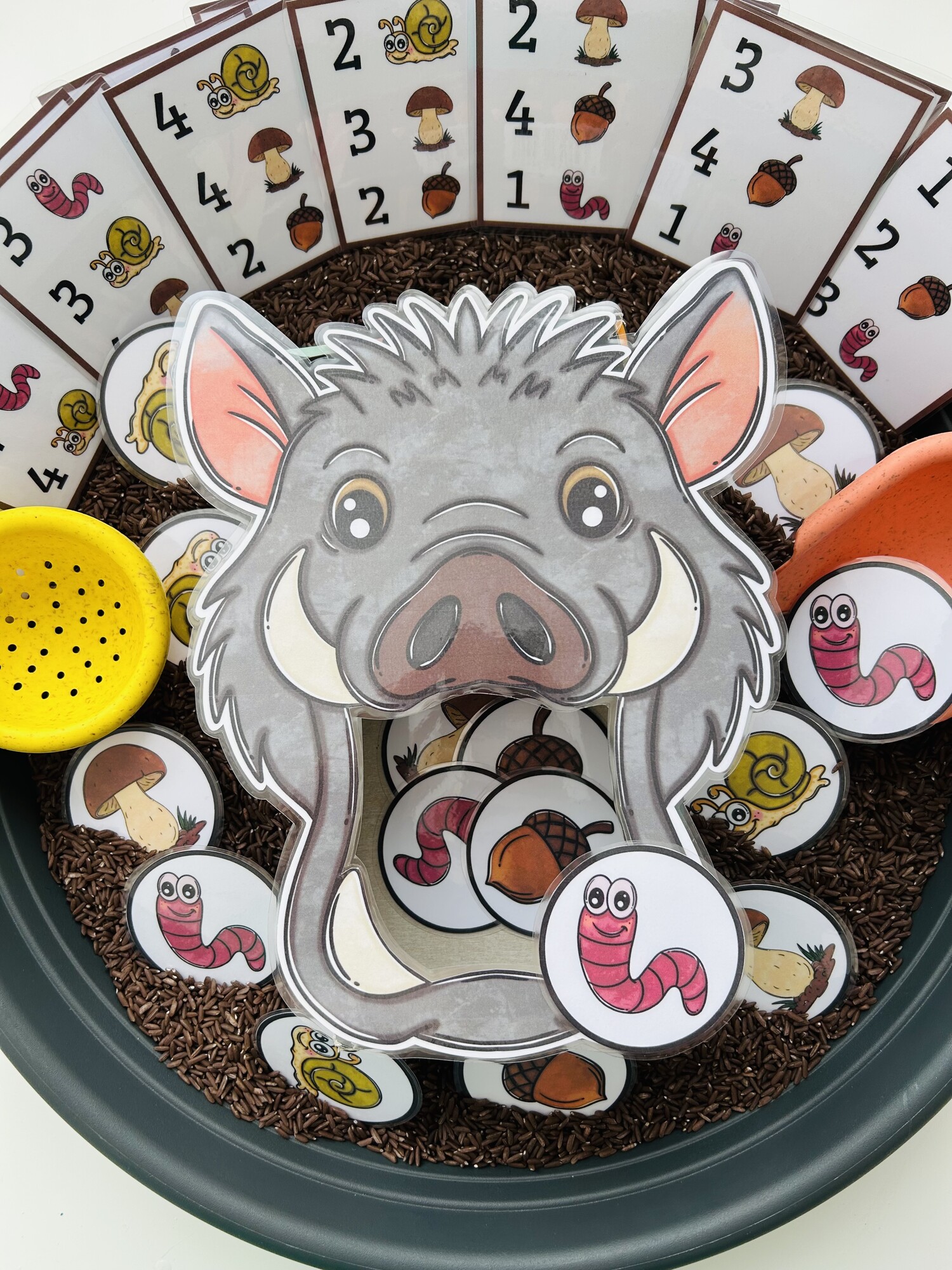 Tento materiál je ako stvorený pre sensory play, ktoré deti prirodzene milujú. Kartičky s potravou sa vkladajú do sypkého materiálu (napr. ryža, cícer, cestoviny), kde ich deti hľadajú, objavujú a následne kŕmia diviaka – čím dochádza k intenzívnemu zapojeniu zmyslov aj sústredenia.