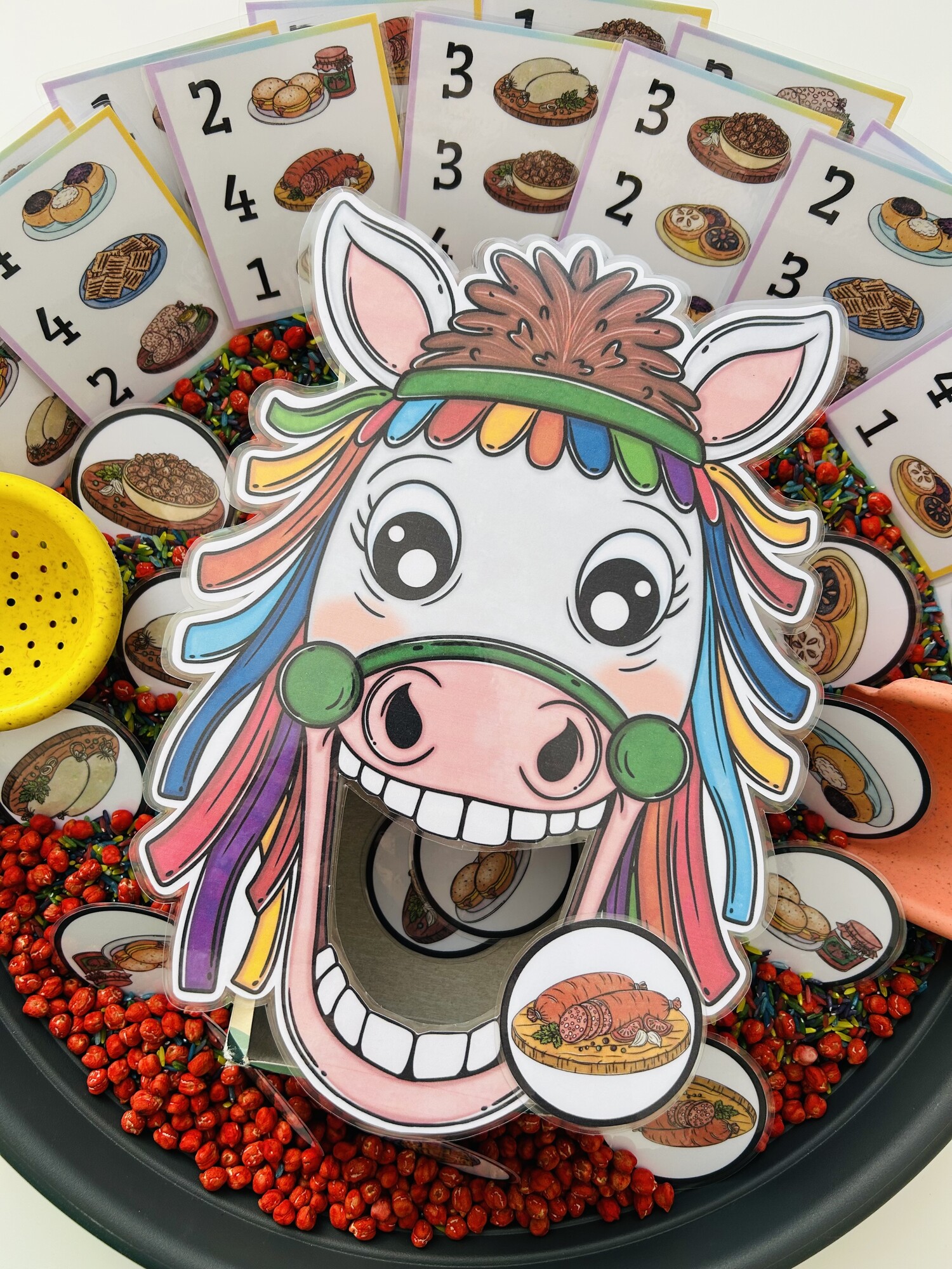 Tento materiál je ako stvorený pre sensory play, ktoré deti prirodzene milujú. Kartičky s potravou sa vkladajú do sypkého materiálu (napr. ryža, cícer, cestoviny), kde ich deti hľadajú, objavujú a následne kŕmia kobylu – čím dochádza k intenzívnemu zapojeniu zmyslov aj sústredenia.