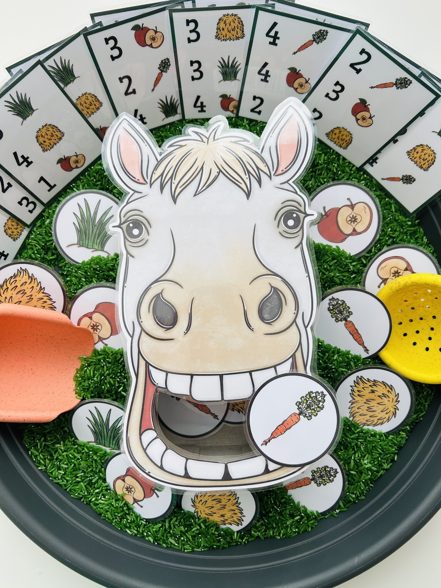Tento materiál je ako stvorený pre sensory play, ktoré deti prirodzene milujú. Kartičky s potravou sa vkladajú do sypkého materiálu (napr. ryža, cícer, cestoviny), kde ich deti hľadajú, objavujú a následne kŕmia koňa – čím dochádza k intenzívnemu zapojeniu zmyslov aj sústredenia.