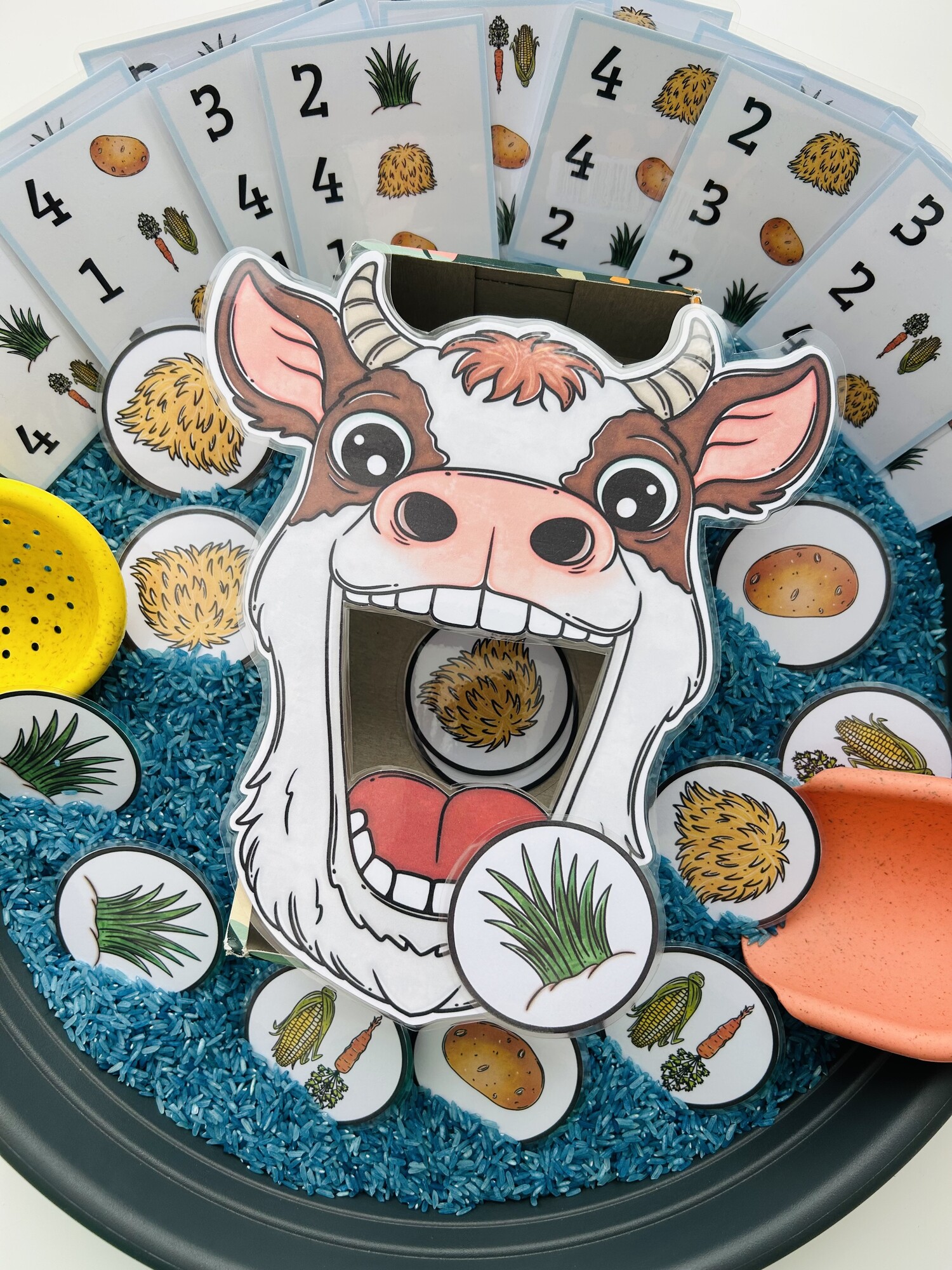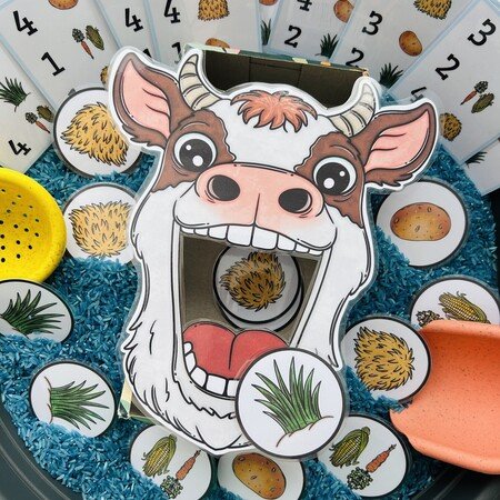 Tento materiál je ako stvorený pre sensory play, ktoré deti prirodzene milujú. Kartičky s potravou sa vkladajú do sypkého materiálu (napr. ryža, cícer, cestoviny), kde ich deti hľadajú, objavujú a následne kŕmia kravu – čím dochádza k intenzívnemu zapojeniu zmyslov aj sústredenia.