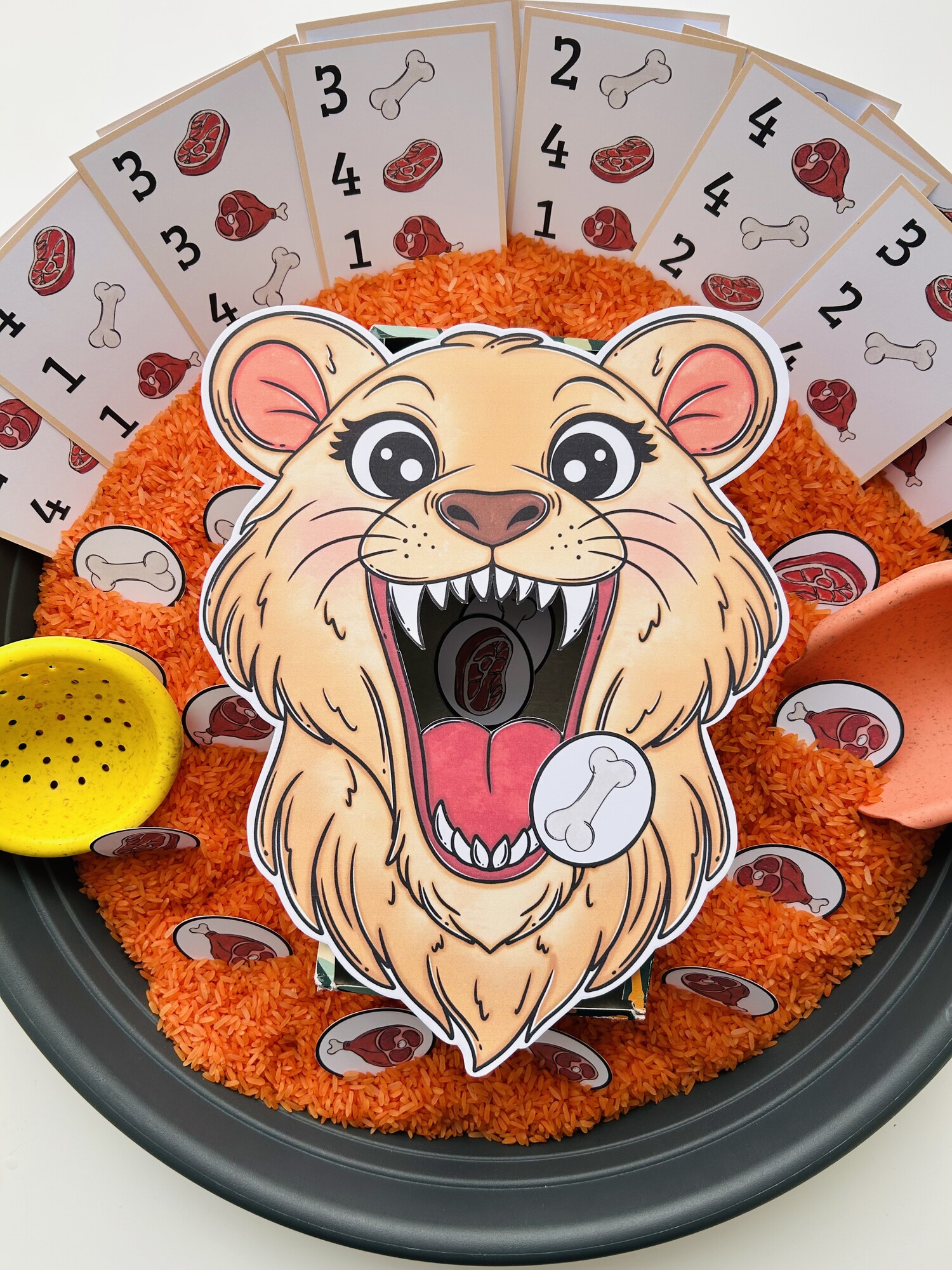 Tento materiál je ako stvorený pre sensory play, ktoré deti prirodzene milujú. Kartičky s potravou sa vkladajú do sypkého materiálu (napr. ryža, cícer, cestoviny), kde ich deti hľadajú, objavujú a následne kŕmia levicu – čím dochádza k intenzívnemu zapojeniu zmyslov aj sústredenia.
