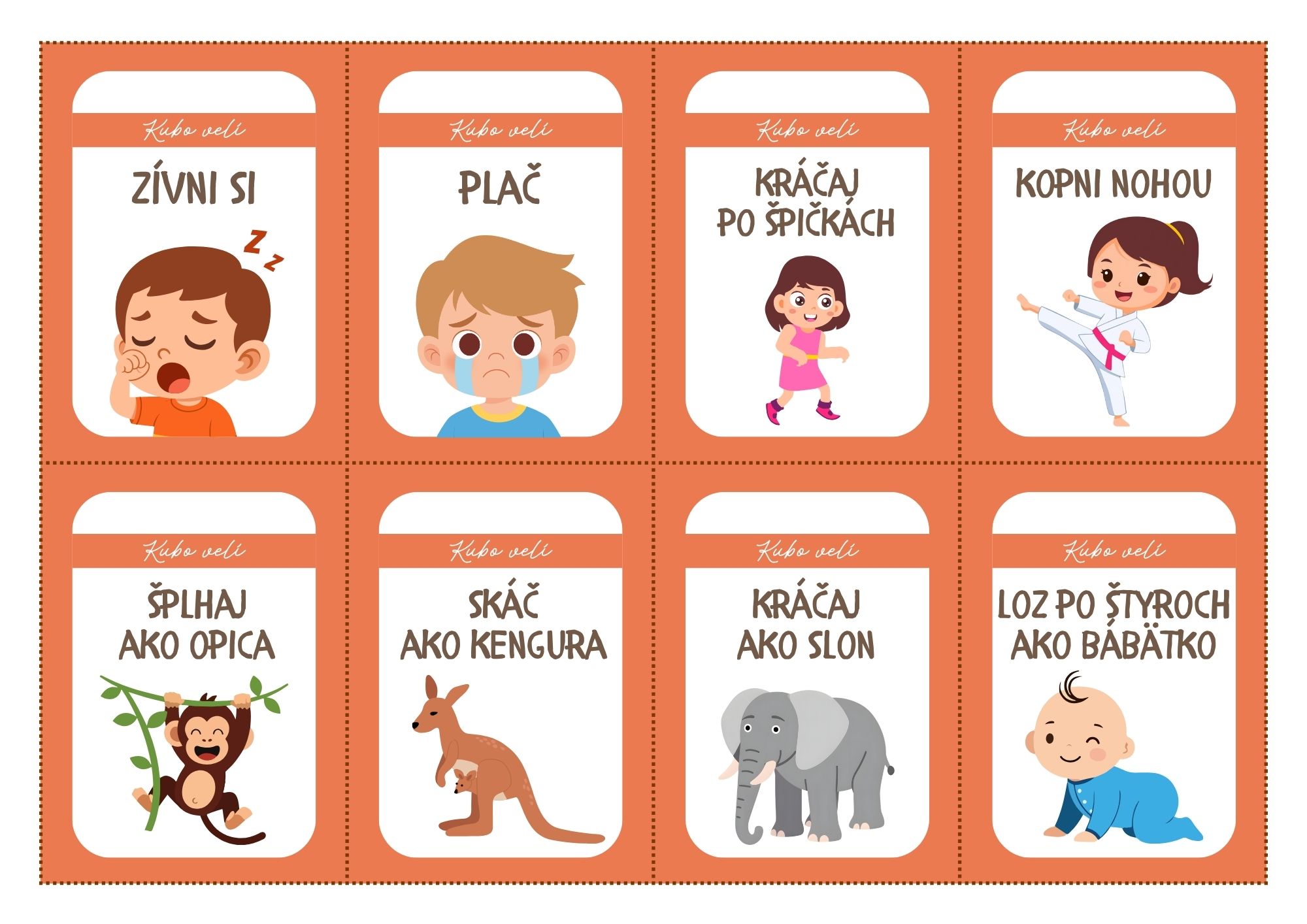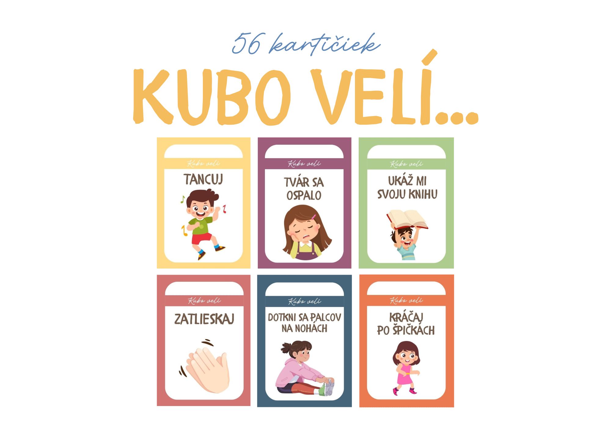 Kubo velí – pohybové kartičky sú ideálne na rýchle rozhýbanie detí počas vyučovania. Kartičky sú vhodné pre deti materskej školy a žiakov 1.–4. ročníka. Dajú sa využiť ako rozcvička, brain break alebo na spestrenie hodiny.