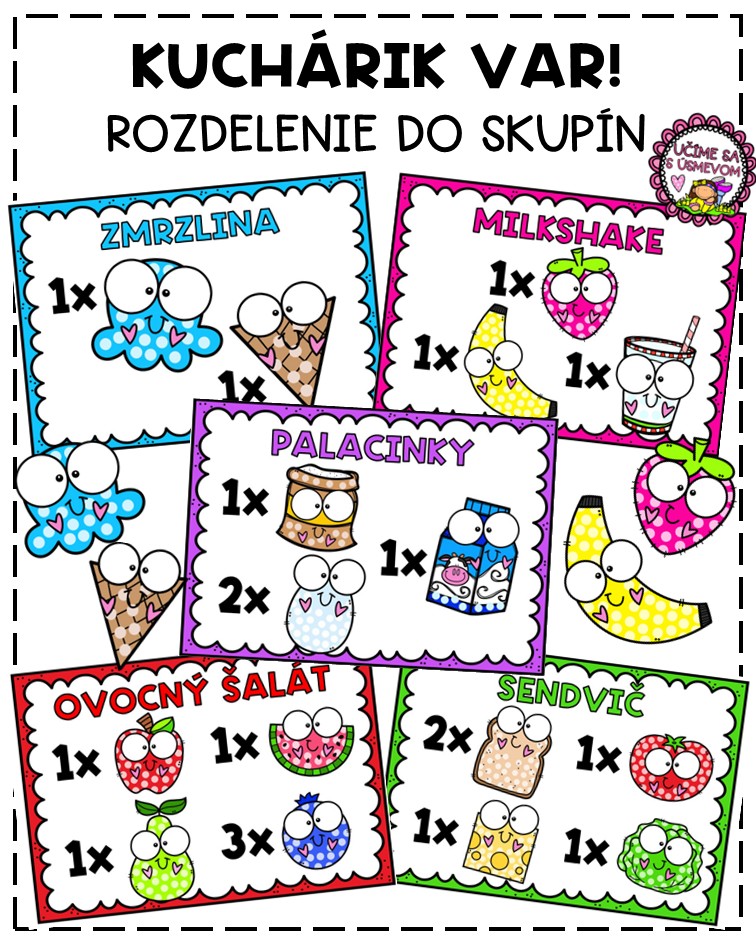 Učiteľ určí, aké veľké skupiny budú žiaci vytvárať a na viditeľné miesto umiestni recept. Každý žiak si vylosuje obrázok suroviny, ktorá patrí do daného receptu. Úlohou žiakov je nájsť spolužiakov a vytvoriť správnu skupinu podľa zadaného pomeru surovín. Napríklad: Ak je recept na palacinky zložený z 2 vajec, 1 mlieka a 1 múky, skupinu musia vytvoriť: