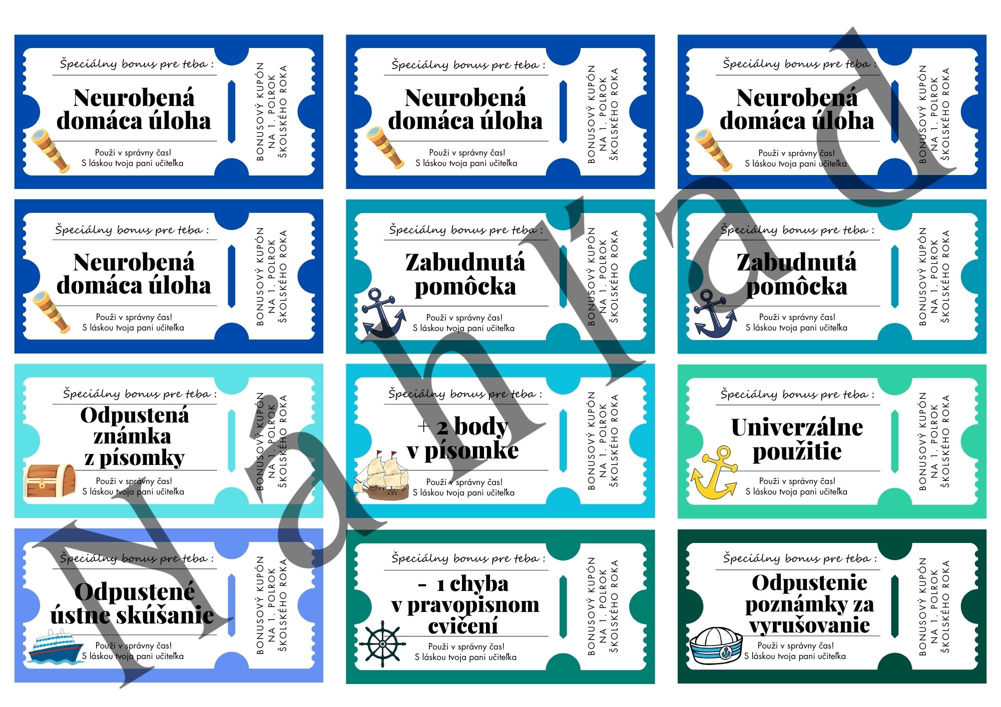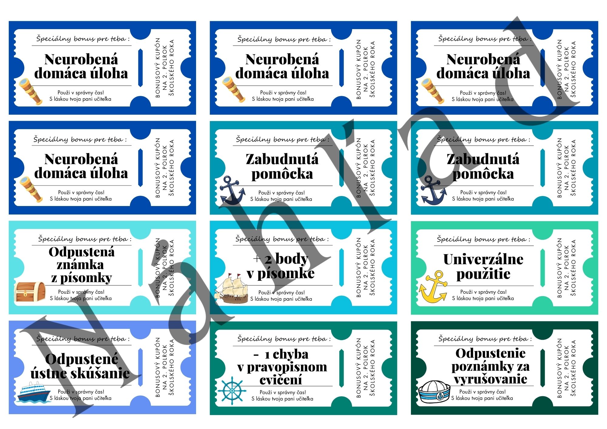 Kupóny sú rozdelené na 1. a 2. polrok, prehľadne spracované a vhodné ako motivačný nástroj do triedy.