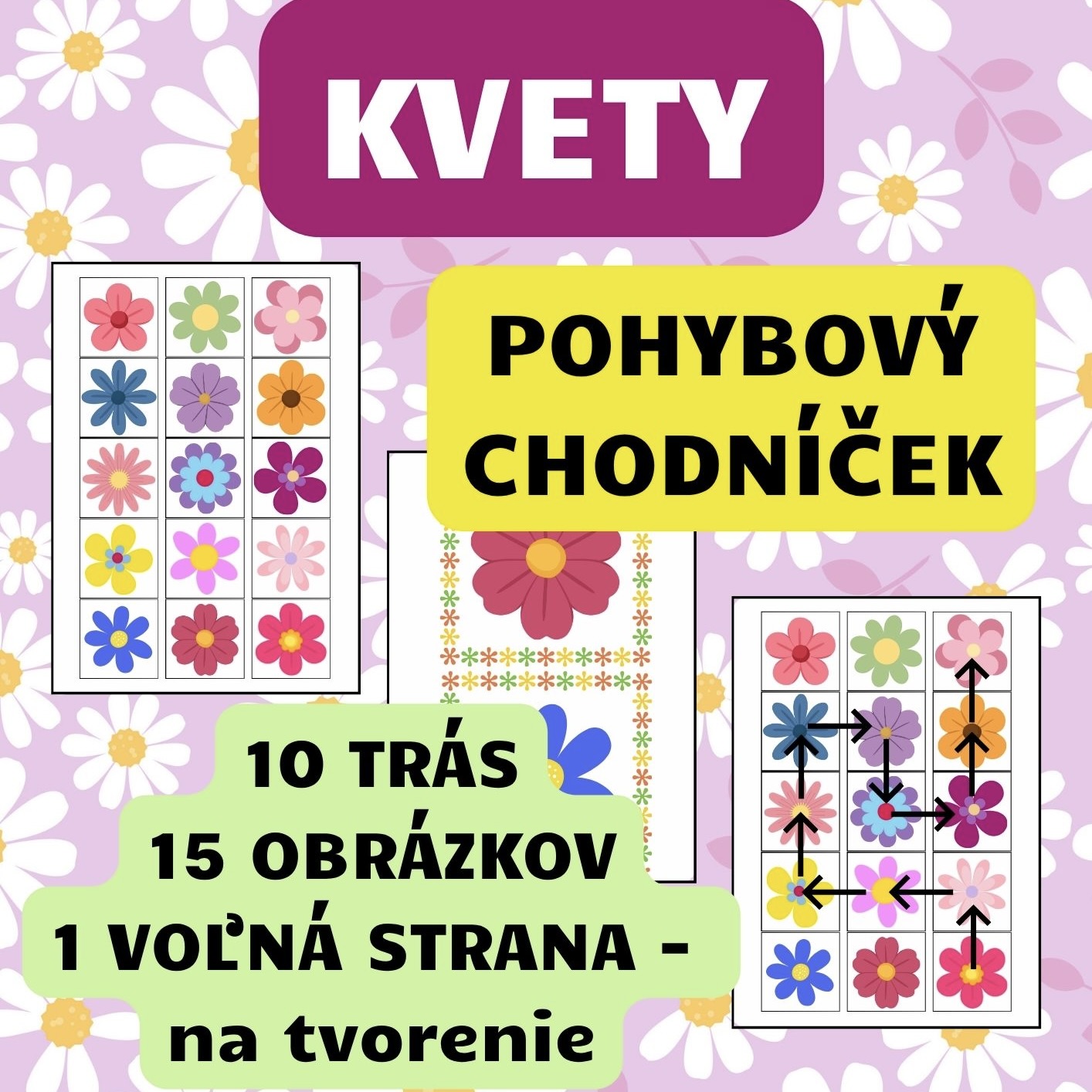 Materiál hravou formou rozvíja priestorovú orientáciu, logické myslenie a základy kódovania..📦 Obsah materiálu:15 veľkých štvorcov s obrázkami10 kartičiek s trasami – rôzne náročné cesty, ktoré musia deti „prečítať“ a prejsť.1 voľná strana pre vlastnú cestičku – pre kreatívnu tvorbu detí alebo pedagóga (pri zalaminovaní je možné používať stierateľnú fixku opakovane).🎯 Vzdelávacie ciele:Pohybová koordinácia: Správne uskutočnenie skokov a krokov v určenom smere.Predmatematické zručnosti: Orientácia v mriežke a v priestore (vpravo/vľavo, vpred/vzad).• •Pracovná pamäť: Schopnosť zapamätať si sekvenciu obrázkov a preniesť ju do pohybu.