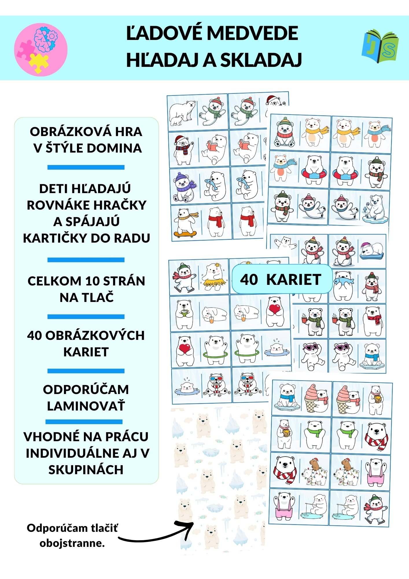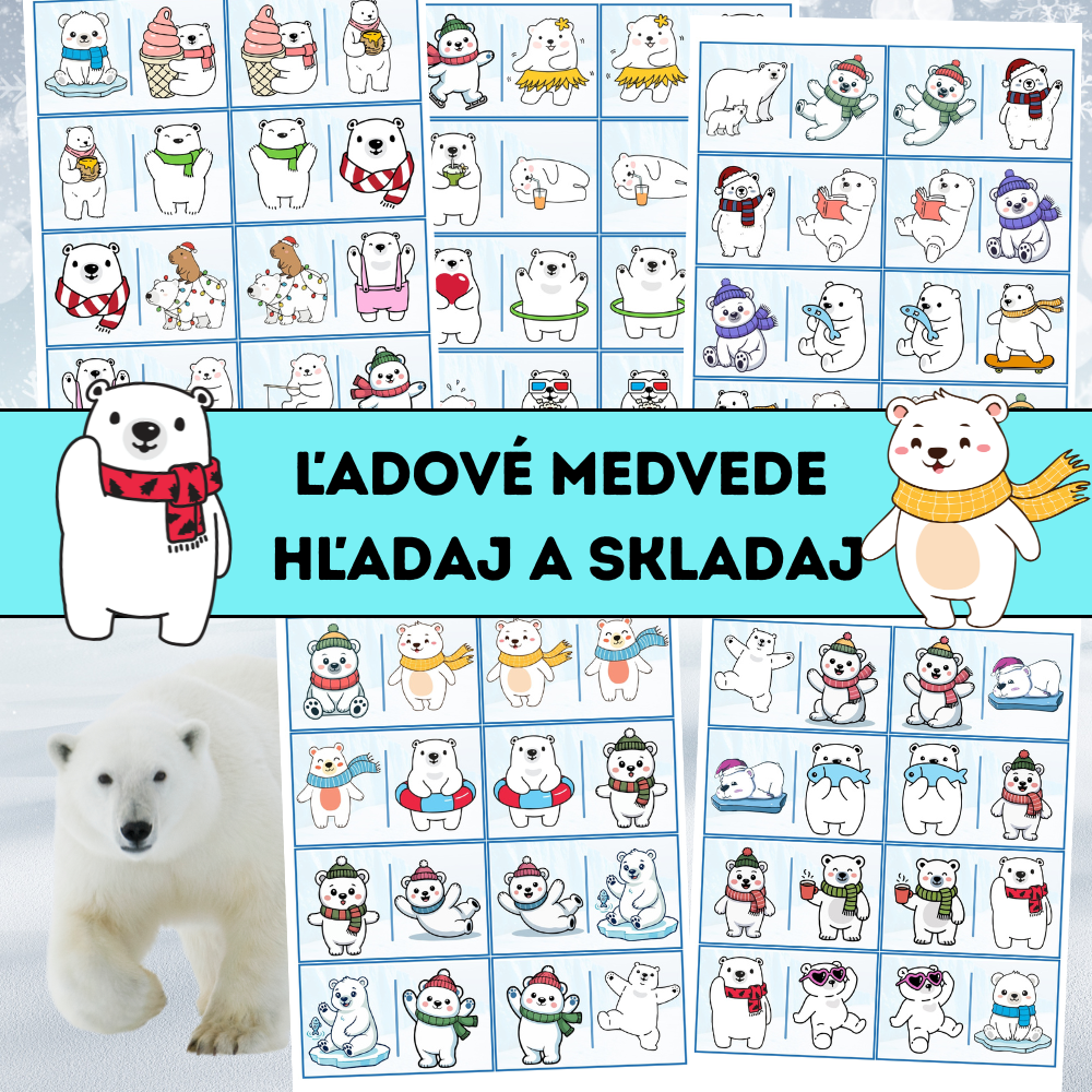 Ľadové medvede – hľadaj a skladaj je obrázková aktivita inšpirovaná princípom domina, zameraná na rozvoj zrakovej percepcie, pozornosti, vizuálnej pamäti a schopnosti porovnávania. Deti pracujú s obrázkovými kartičkami, hľadajú rovnaké medvede a spájajú ich do radu, čím vzniká tzv. „domino had“.
