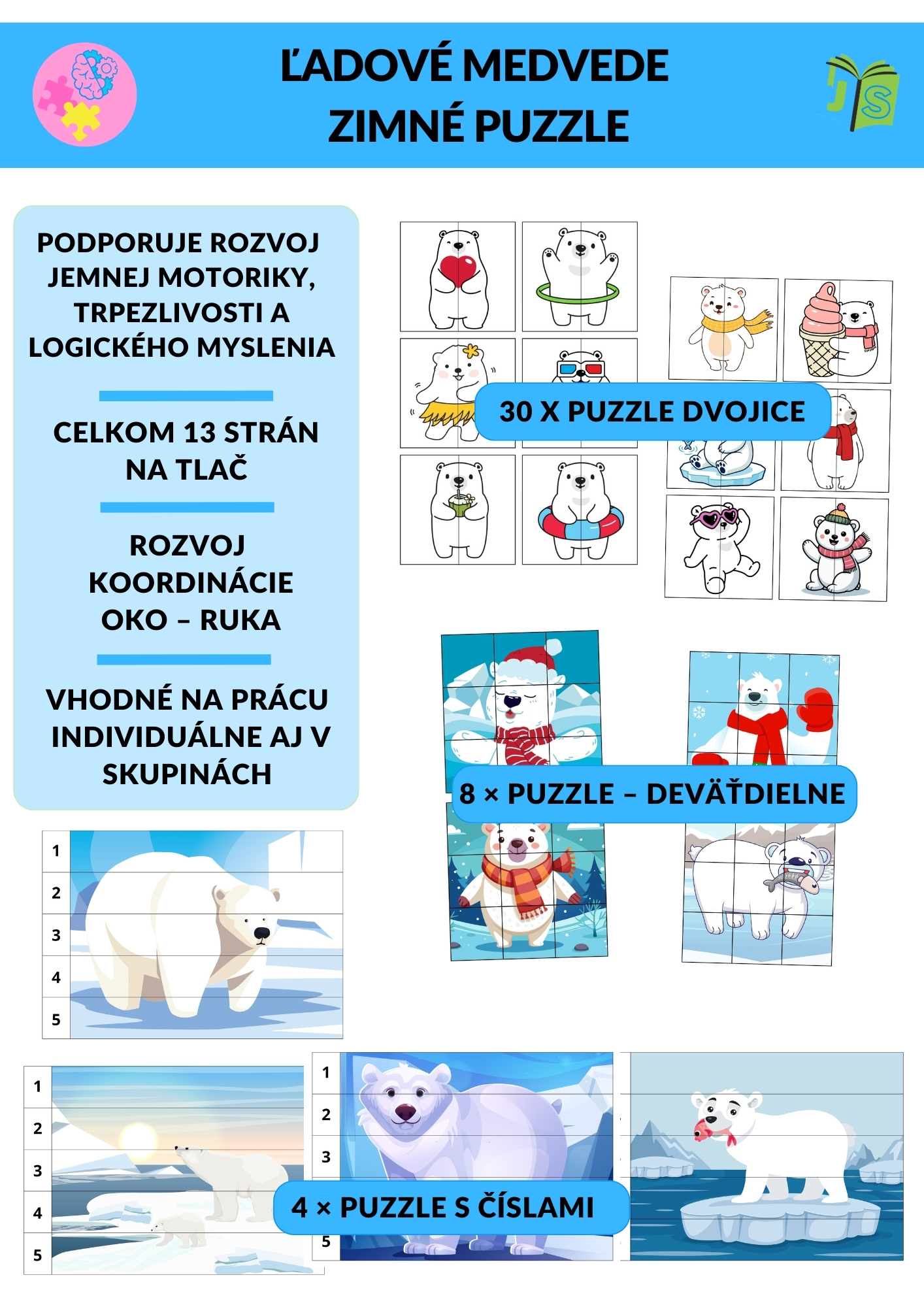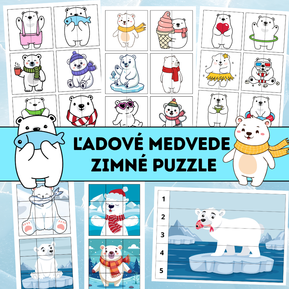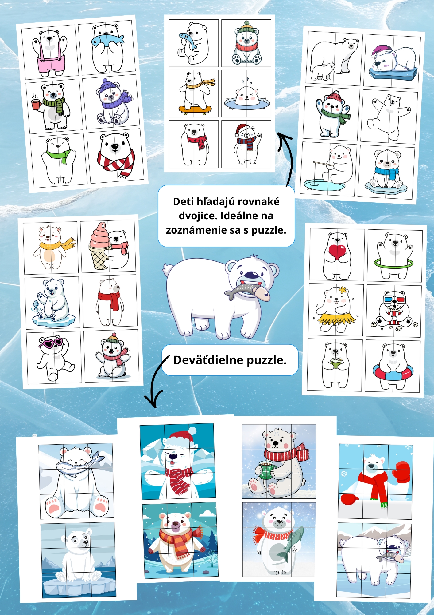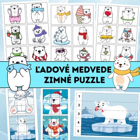 Ľadové medvede – zimné puzzle je obrázková aktivita zameraná na rozvoj vizuálnej percepcie, pozornosti, jemnej motoriky a logického myslenia u detí predškolského a mladšieho školského veku. Materiál obsahuje tri typy puzzle úloh rôznej náročnosti – párovanie obrázkov, skladanie deväťdielneho puzzle a skladanie obrázkov podľa čísel 1–5.