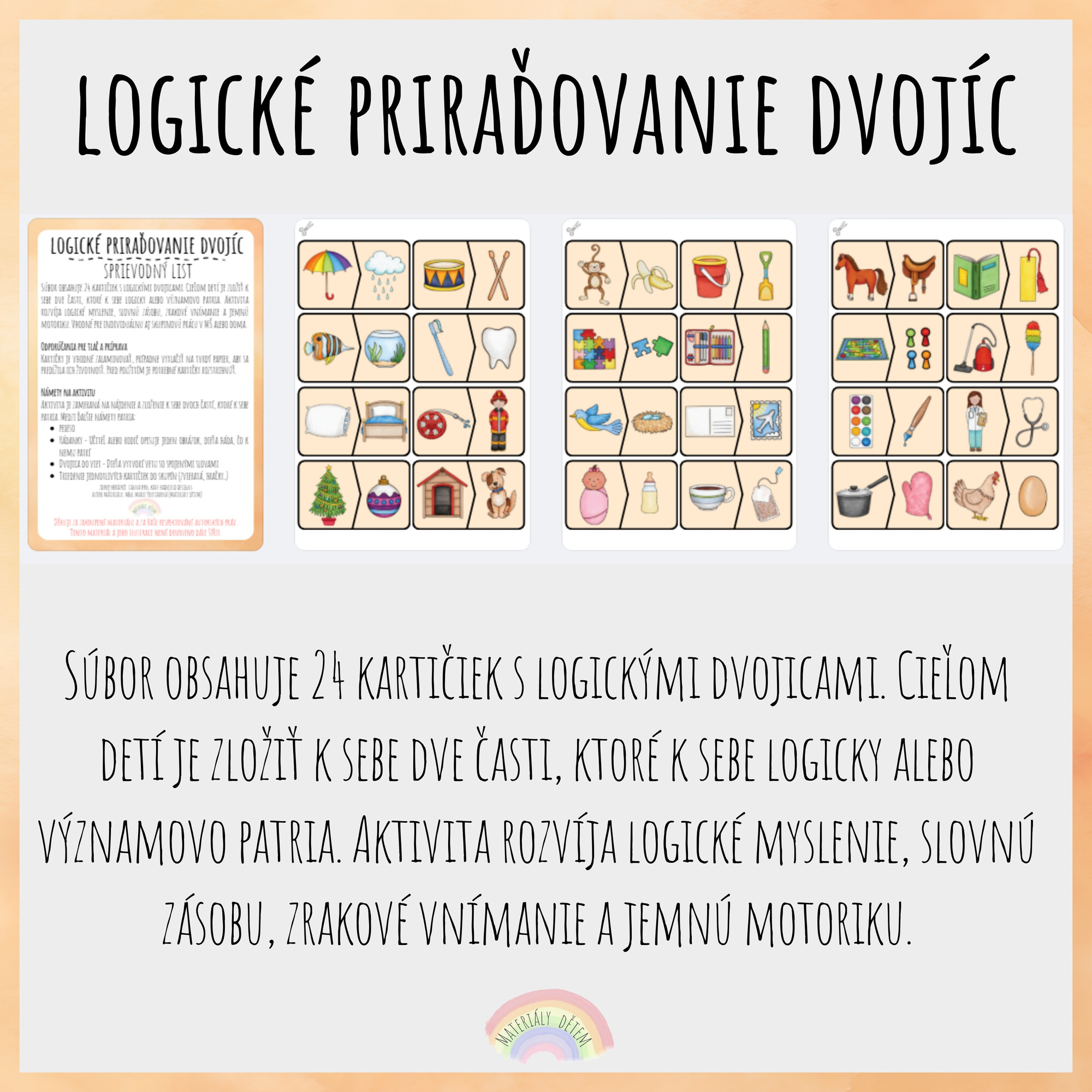 Súbor obsahuje 24 kartičiek s logickými dvojicami. Cieľom detí je zložiť k sebe dve časti, ktoré k sebe logicky alebo významovo patria. Aktivita rozvíja logické myslenie, slovnú zásobu, zrakové vnímanie a jemnú motoriku. Vhodné pre individuálnu aj skupinovú prácu v MŠ alebo doma.