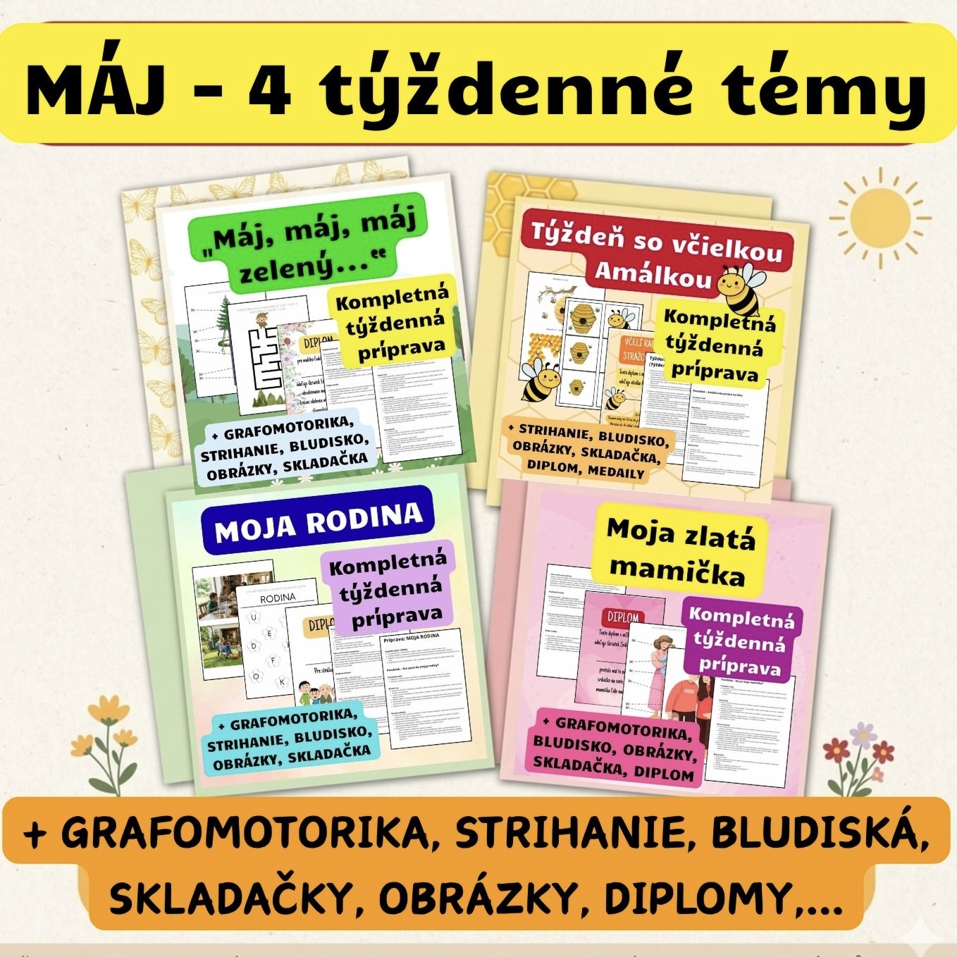 Ušetrite si čas s plánovaním a užite si máj s deťmi bez stresu! Materiály sú navrhnuté tak, aby hravou formou rozvíjali reč, logiku aj jemnú motoriku. 🎨✂️