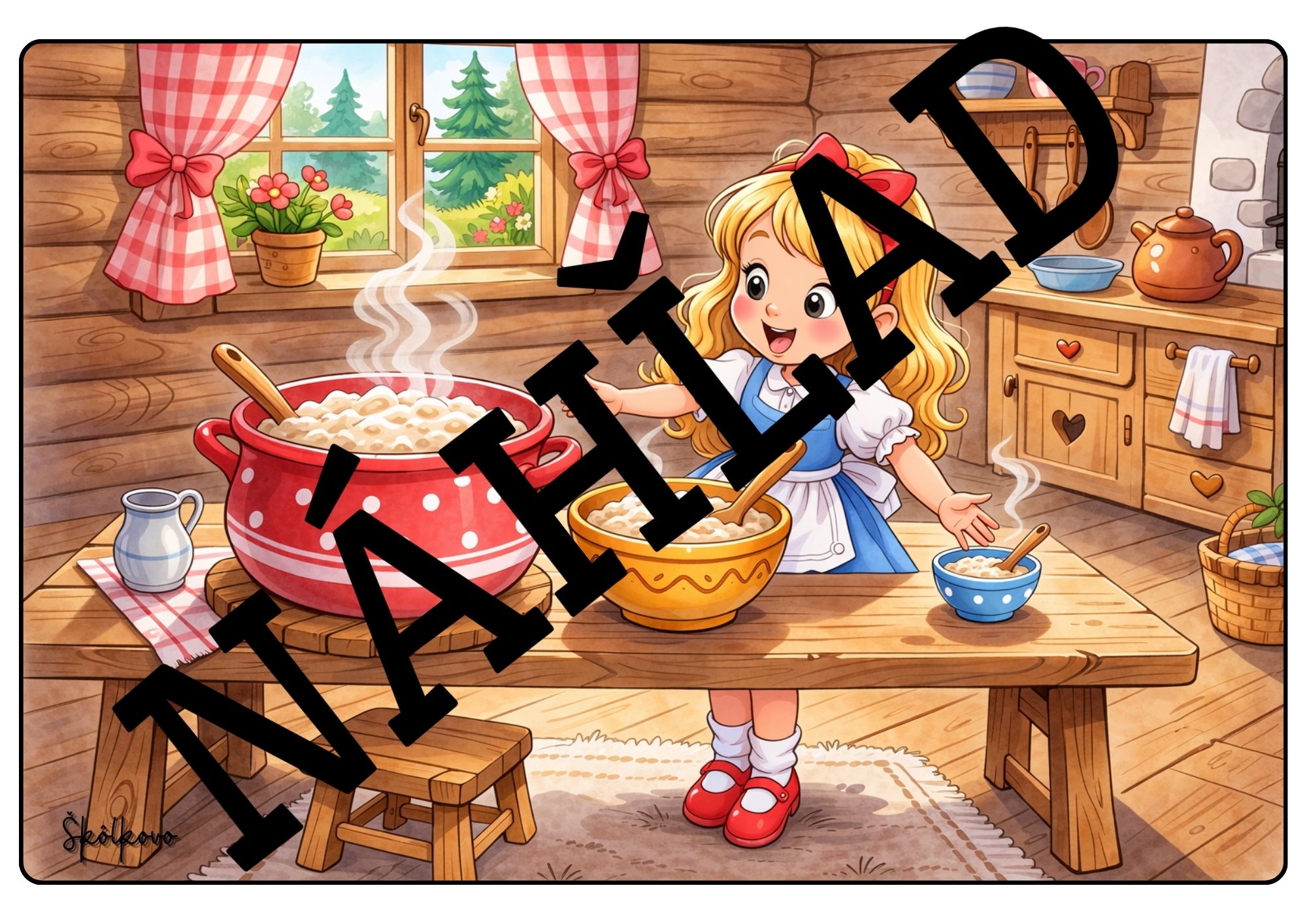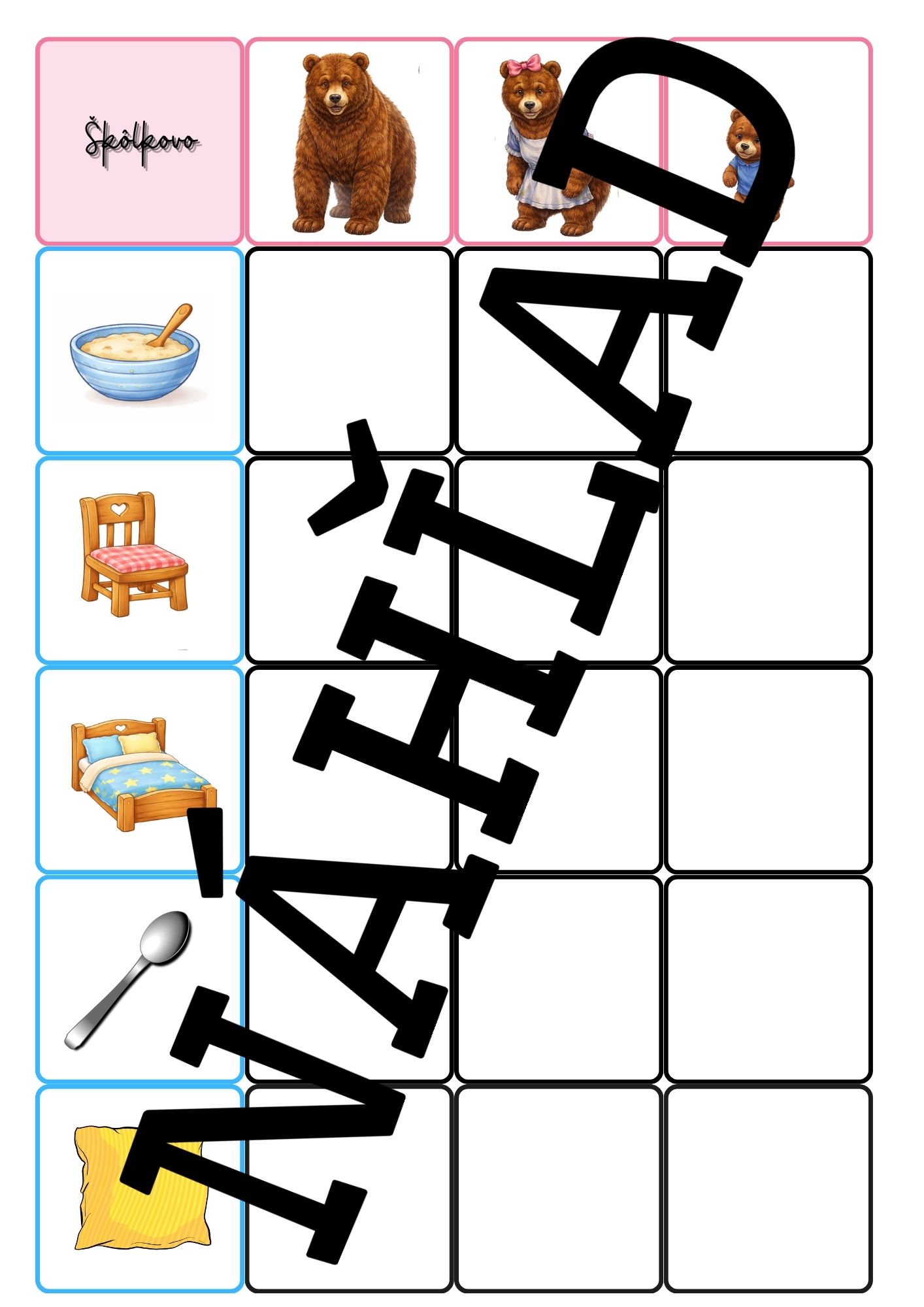 - ROZPRÁVKA O TROCH MEDVEĎOCH - plagát, puzzle, omaľovánka, tabuľka na triedenie a porovnávanie veľkosti predmetov, obrázky deja