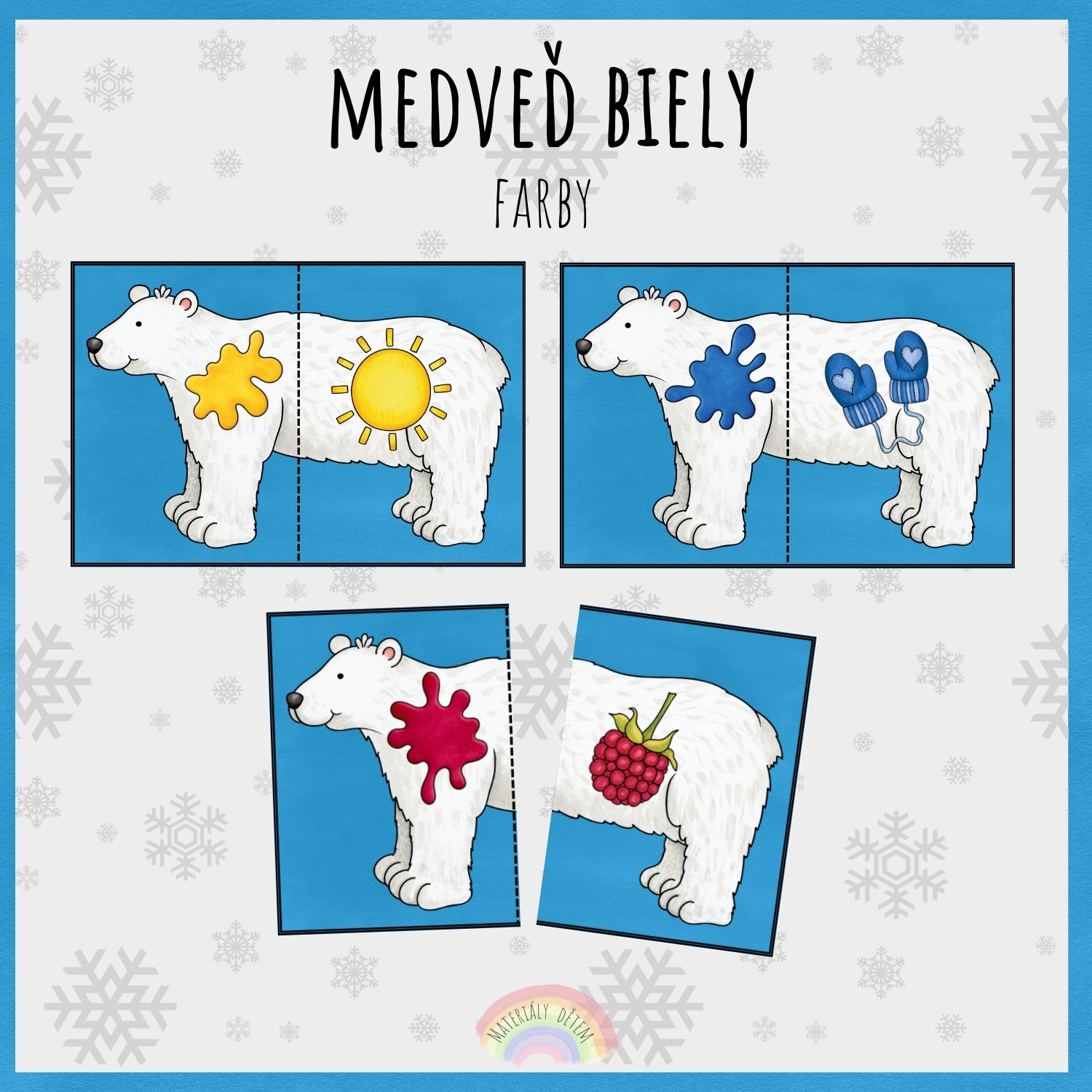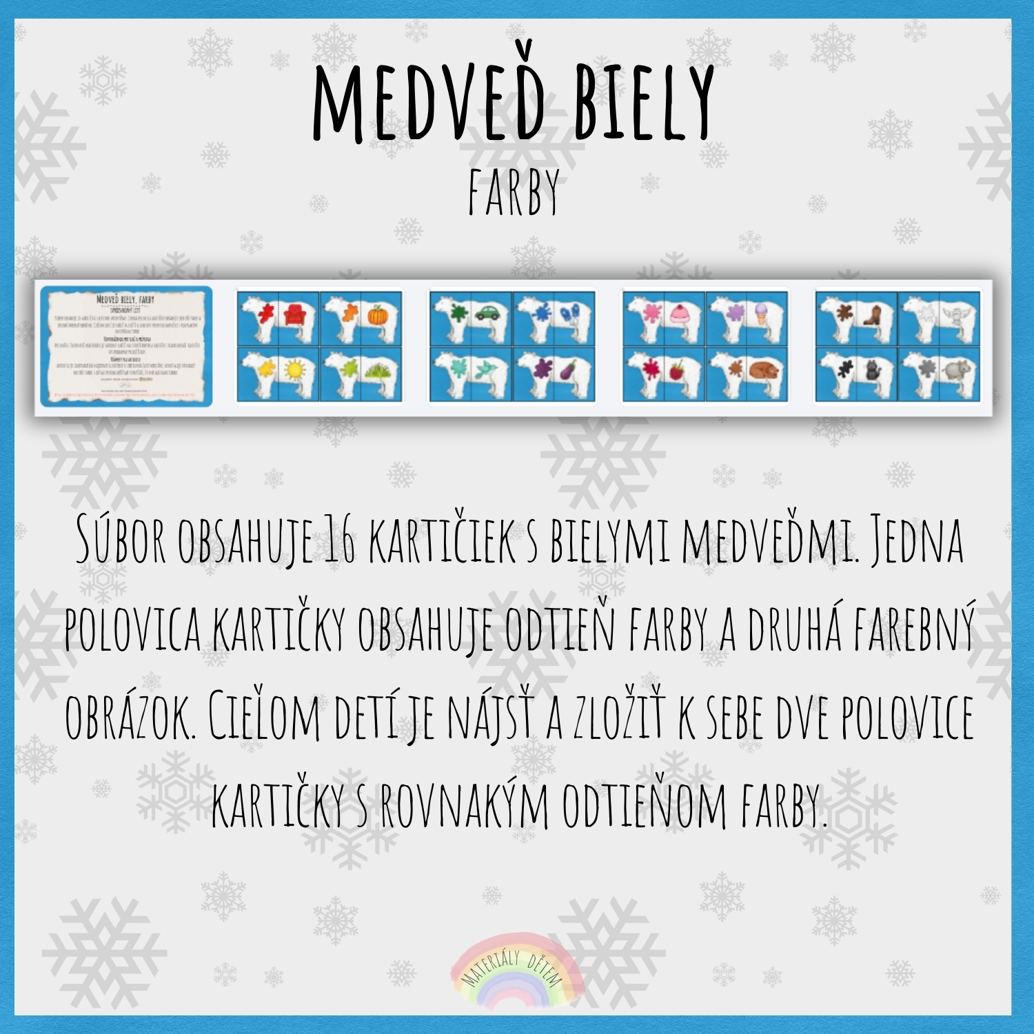 Súbor obsahuje 16 kartičiek s bielymi medveďmi. Jedna polovica kartičky obsahuje odtieň farby a druhá farebný obrázok. Cieľom detí je nájsť a zložiť k sebe dve polovice kartičky s rovnakým odtieňom farby.
