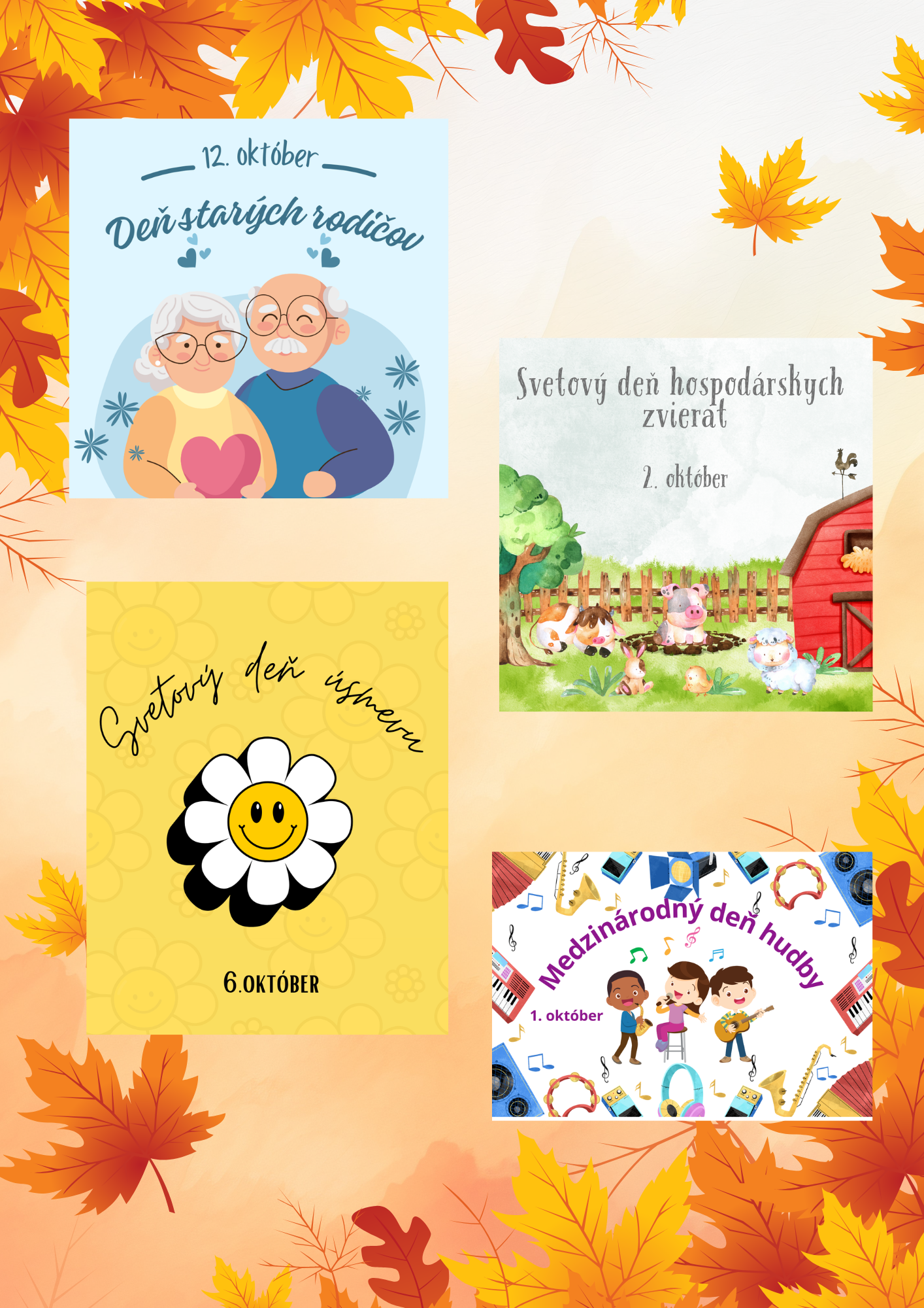 Súbor obsahuje plagáty na významné dni v mesiaci október: deň cestovín, deň stromov, deň starých rodičov, deň úsmevu, deň pošty, deň hudby, deň hospodárskych zvierat, deň bielej palice, deň zraku, deň jabĺčka