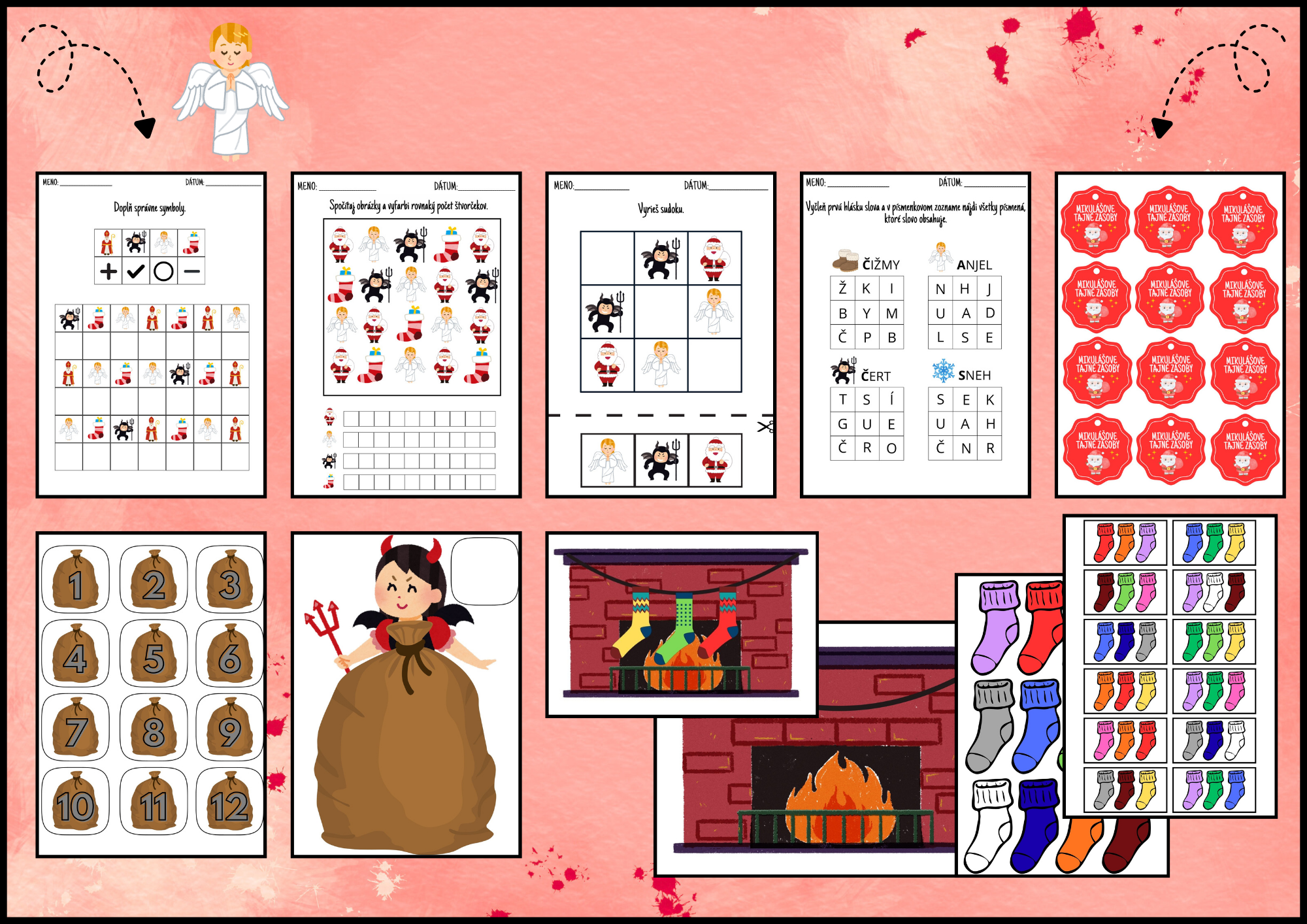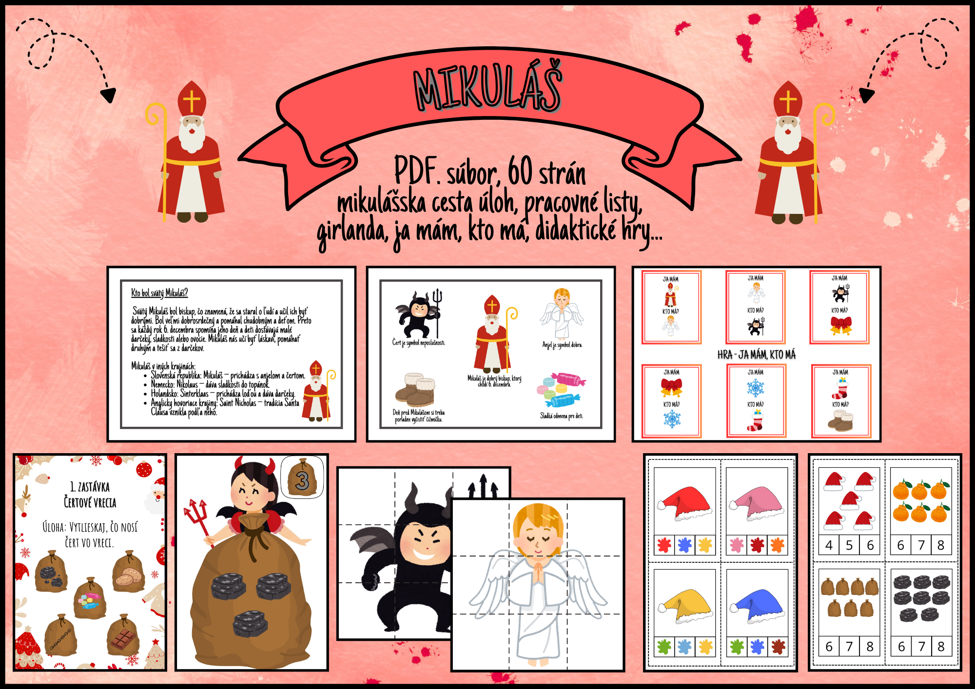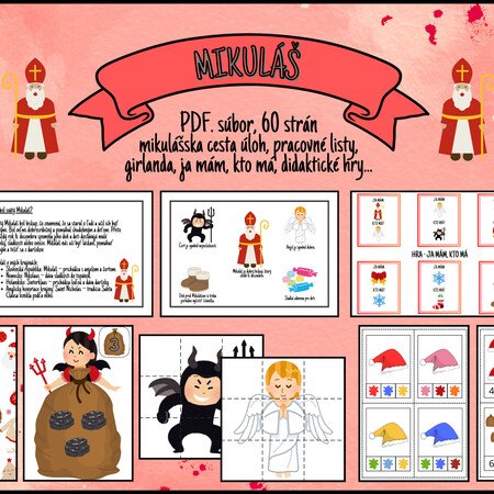 Milé pani učitel'ky, vychovávateľky, rodičia. Pripravila som si pre vás 60 strán pracovných listov na tému „Mikuláš.” V tomto PDF. súbore nájdete: