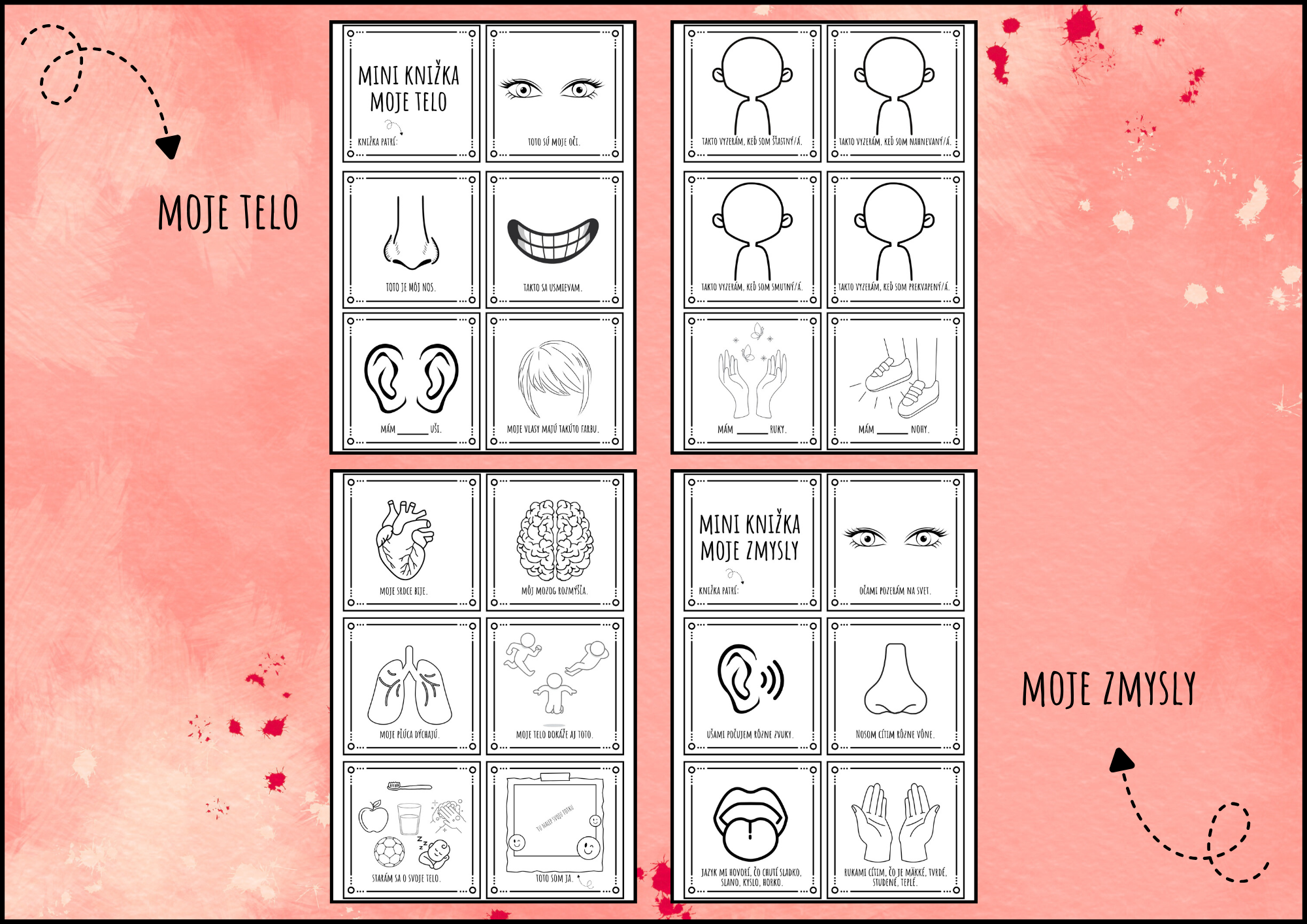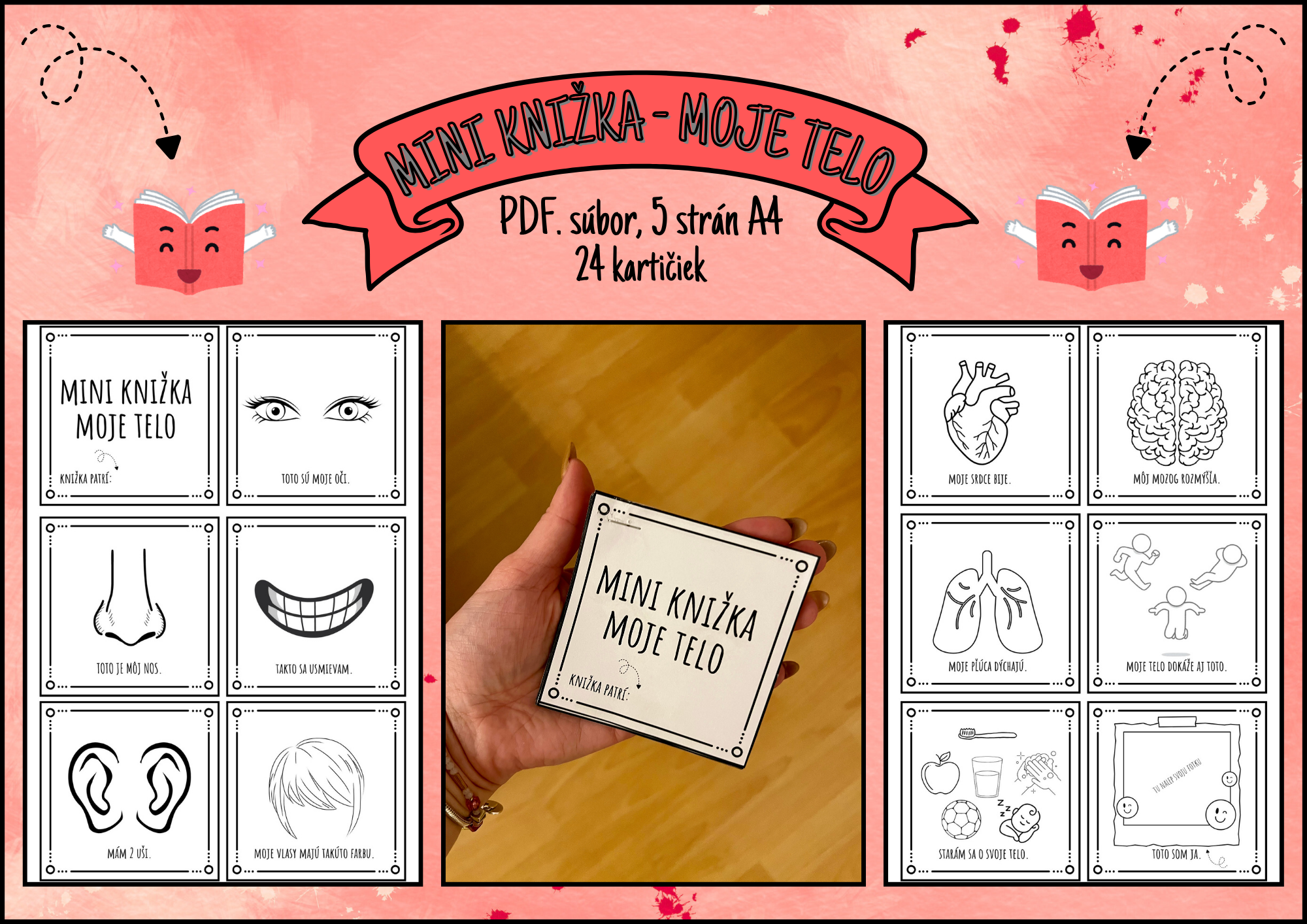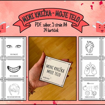 Milé pani učiteľky, predstavujeme vám mini knižku „Moje telo“, určenú pre deti v materskej škole. Táto pracovná mini knižka obsahuje 24 mini kartičiek, kde deti objavujú svoje telo, zmysly, emócie a jednoduché zásady starostlivosti o zdravie. Každá strana ponúka jednoduchú činnosť – deti vyfarbujú, dopĺňajú alebo dokresľujú detaily podľa zadania.