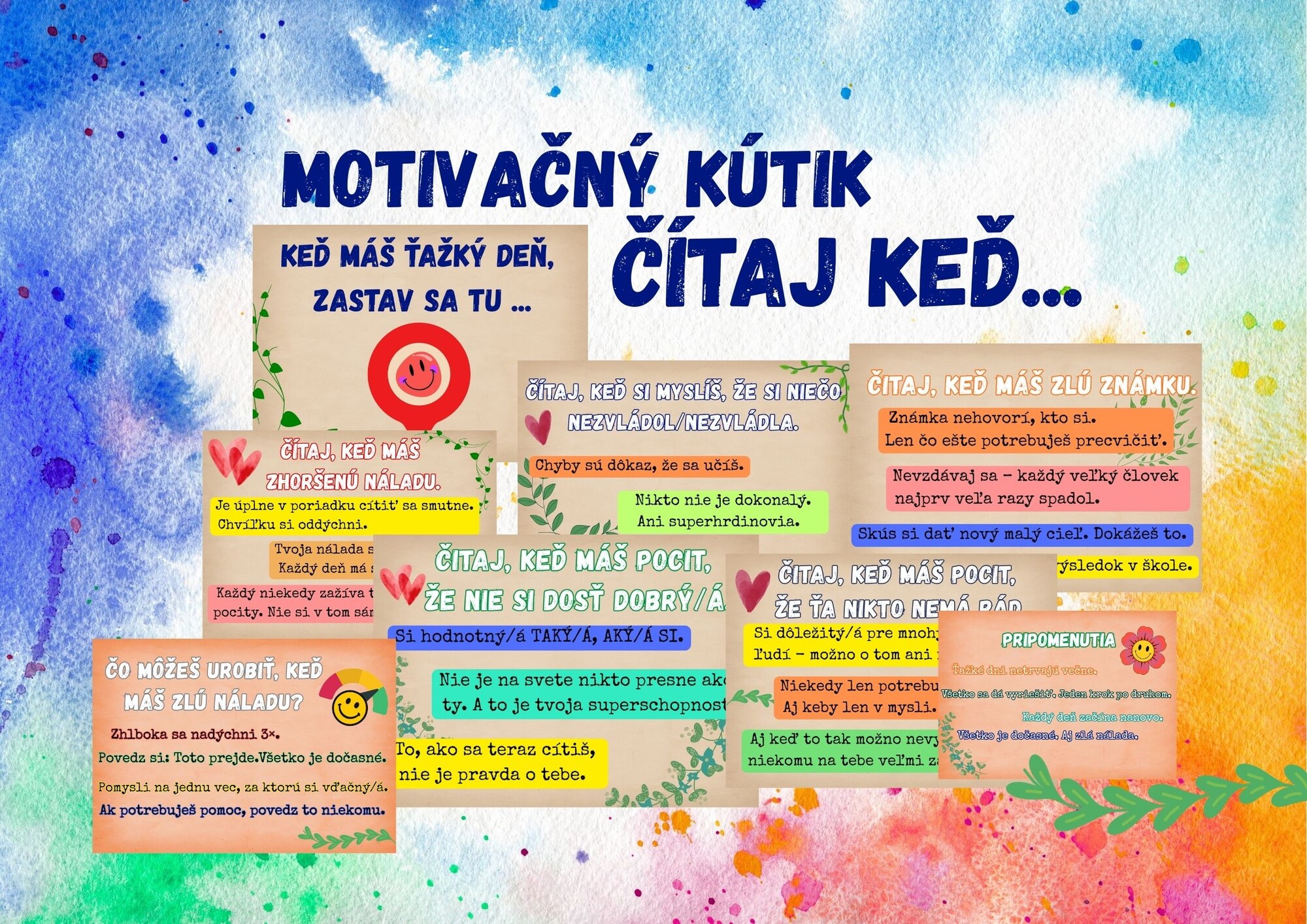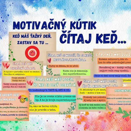 Tento materiál je určený ako podporný motivačný kútik pre deti, ktorý pomáha zvládať náročné emócie, pochybnosti o sebe, neúspech v škole či pocity osamelosti.